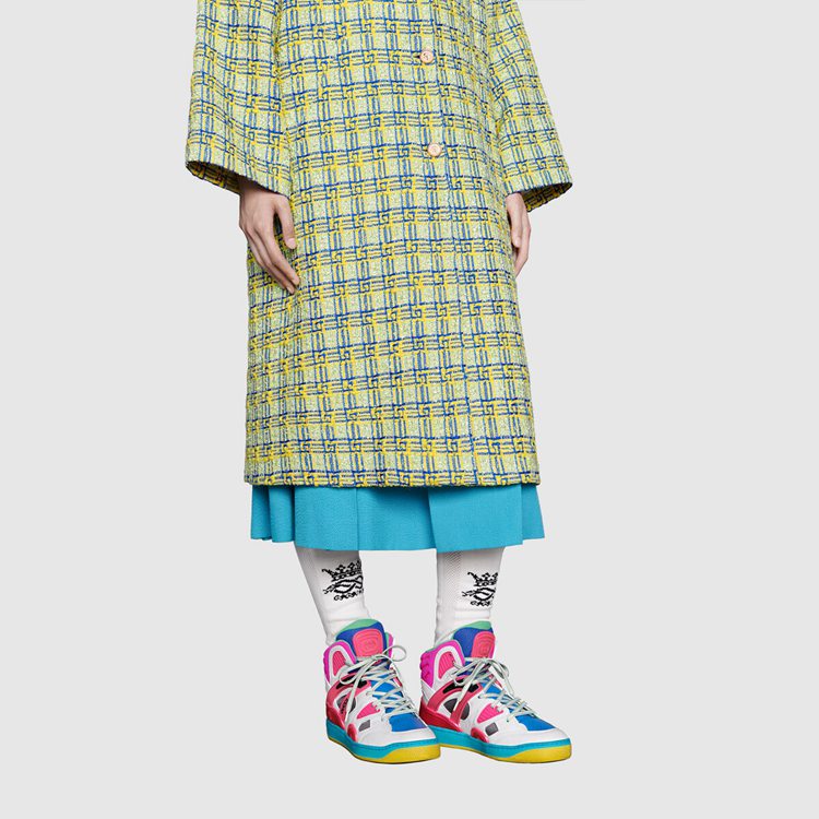 Style 661311 2SH80 9063 Sporting a look synonymous With basketball sneakers from The ‘90s, The House introduces The newest rendition of The lace-up sneaker— Gucci Basket. This high-top style emulates The self-expression of on-court aesthetic With distinctive features and detailing. Offered in a mix of brightly colored fabrics and finished With a lightly distressed effect, each pair is Crafted primarily from Demetra. Created With The same processes used For tanning, The New material offers pliable and resilient performance With a supple finish. The eco-friendly material combines animal-free raw materials primarily from sustainable, renewable, and bio-based sources.