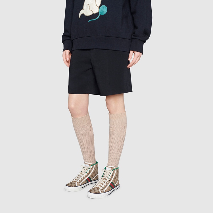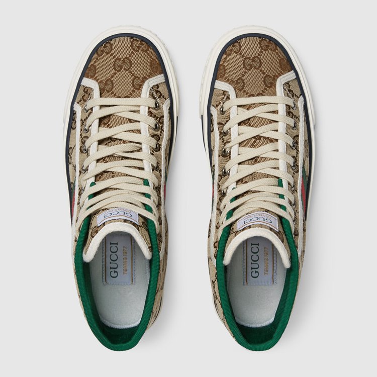 Style 627838 HVK70 9765 The Gucci Tennis 1977 sneaker is presented in a high-top version For The Pre-Fall 2020 collection. The sneaker is Crafted from a monogram canvas that combines With The textured GG motif at The sole and The House Web. The style is finished With a dedicated label With The name of The line and a subtle embroidered detail of The number 77.