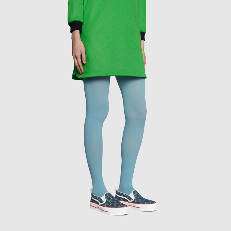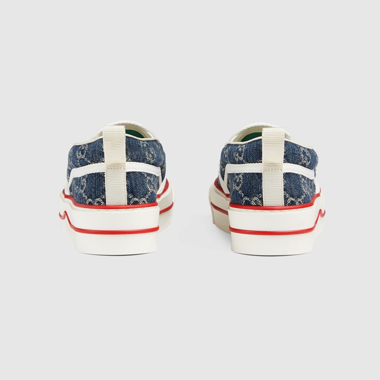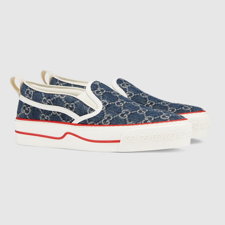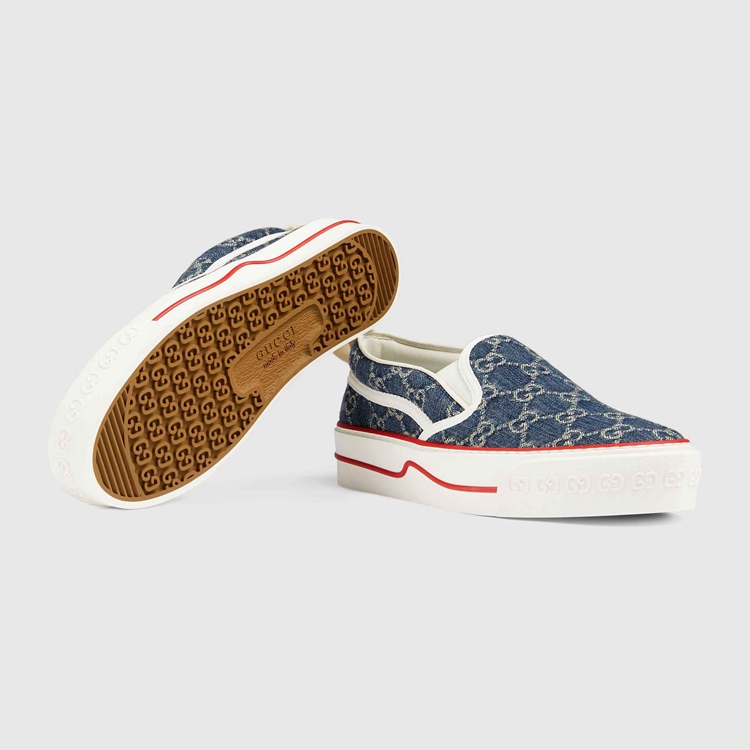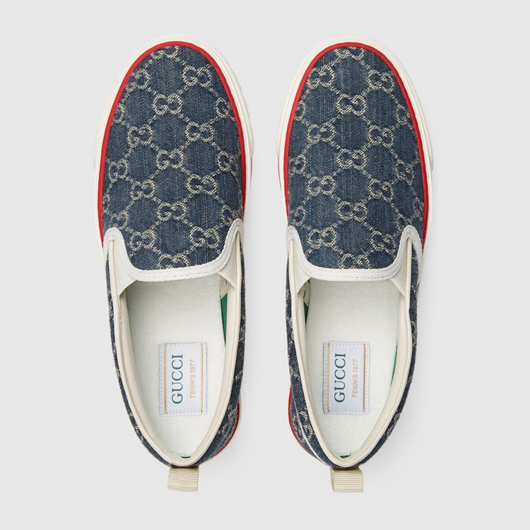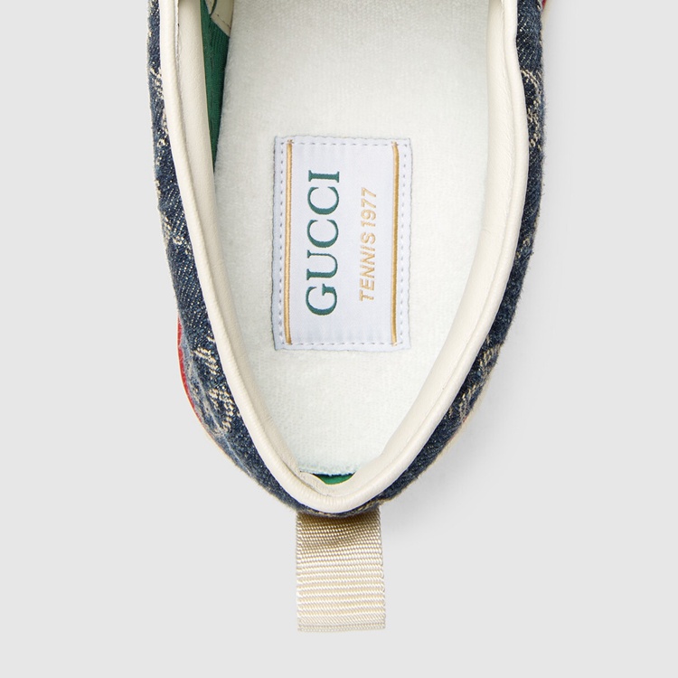 Style 624733 2KQ30 4466 The world of Gucci Tennis 1977 evolves With The introduction of a slip-on sneaker Crafted from organic jacquard denim. With an allover GG motif, The shoe has a strong logo feel. Each season, The House’s monogram is reimagined and reinterpreted into New materials and styles.