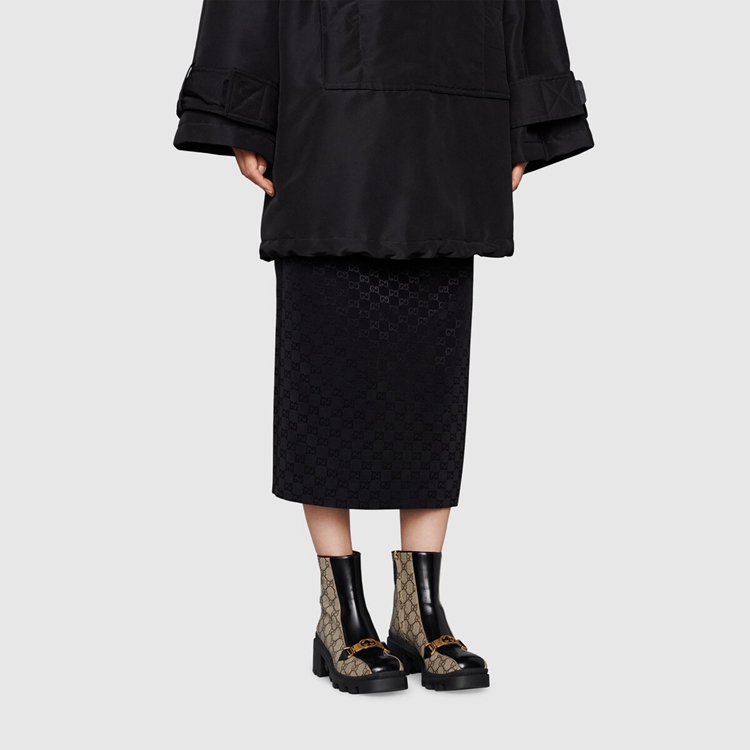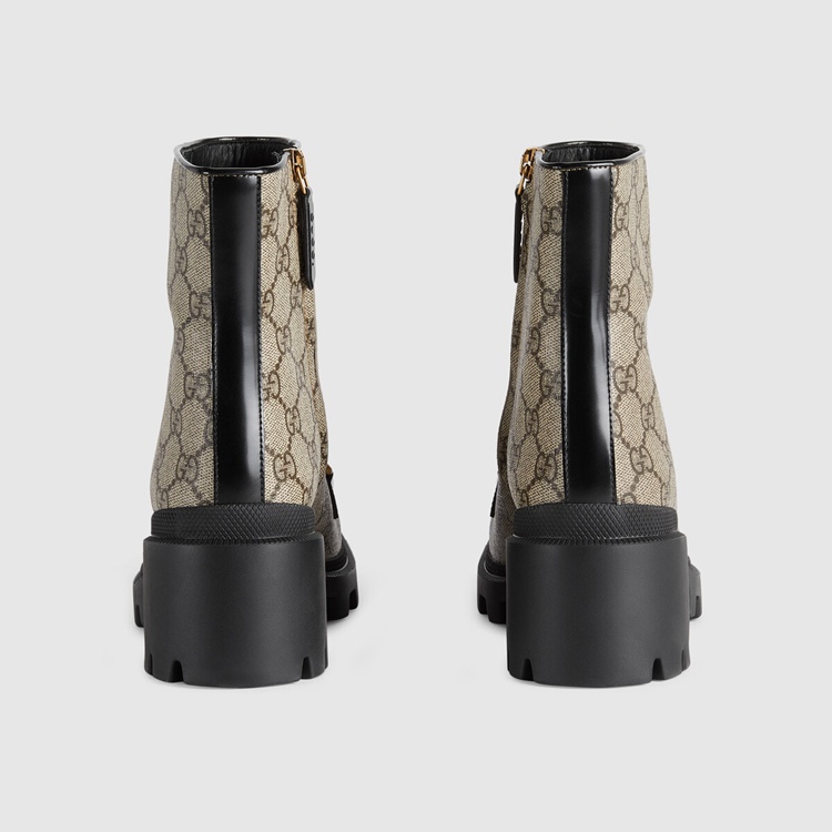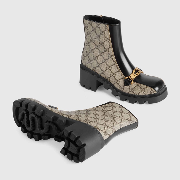 Style 670412 2OQ50 9763Unexpected materials, shapes and details come together throughout The Gucci Aria collection. This pair of ankle boots mixes vintage, sports and equestrian influences to create a hybrid design. Crafted from GG Supreme canvas, a material from The archives, The shoe is completed by a chunky lug sole and Interlocking G Horsebit hardware.
