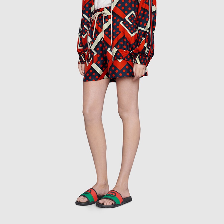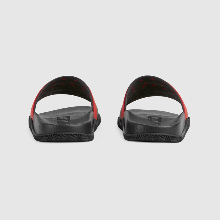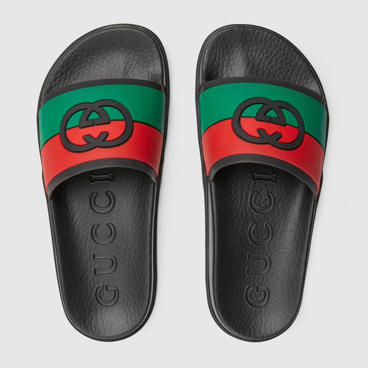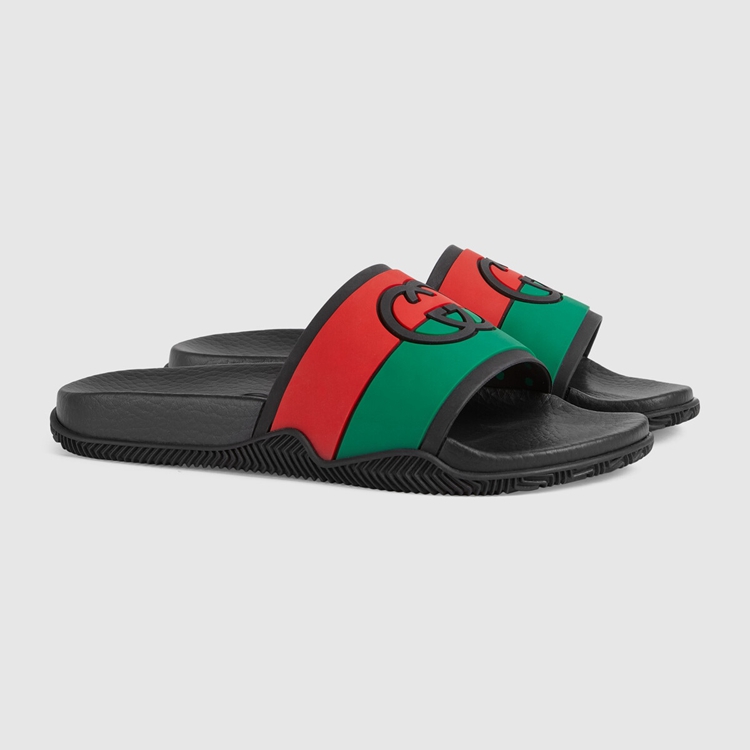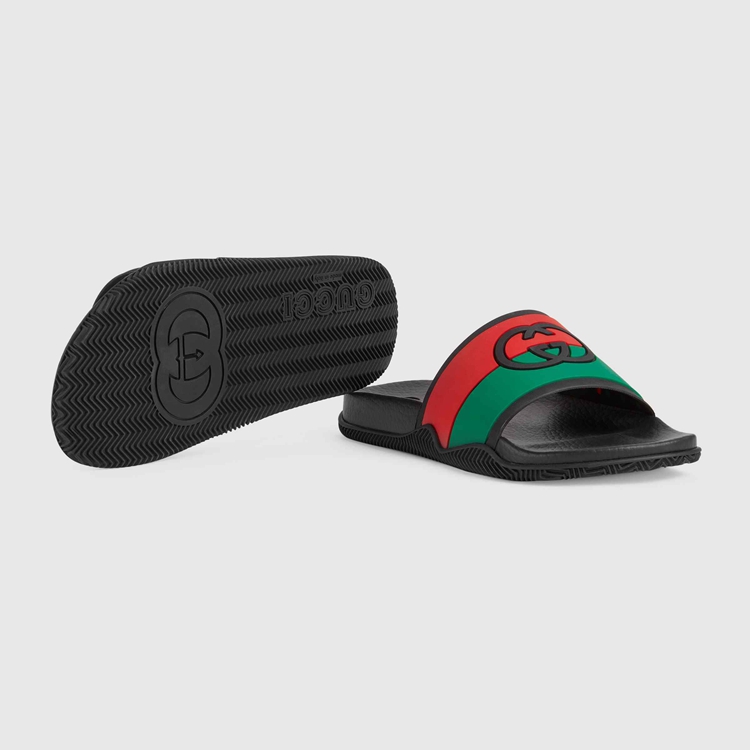 - Red and green Interlocking G striped rubber and black footbed
