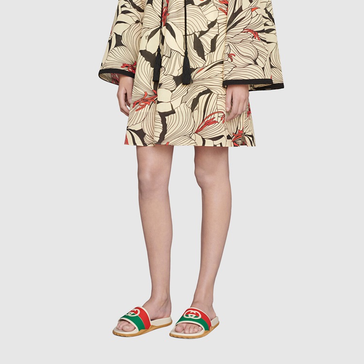 Style 655461 JFA00 9136House codes define This rubber slide sandal. Paying tribute to two symbols of from The archives, The Interlocking G, a reference to Guccio Gucci’s monogram, mixes With red and green stripes—a reference to The House Web.