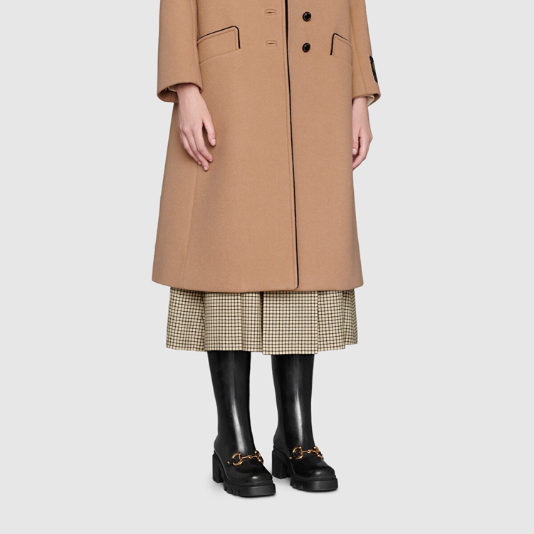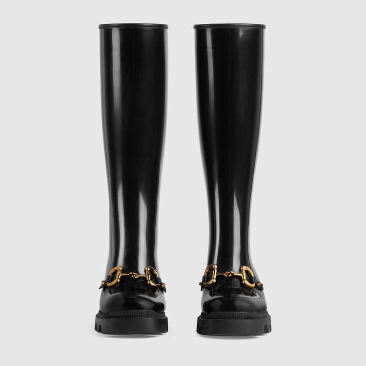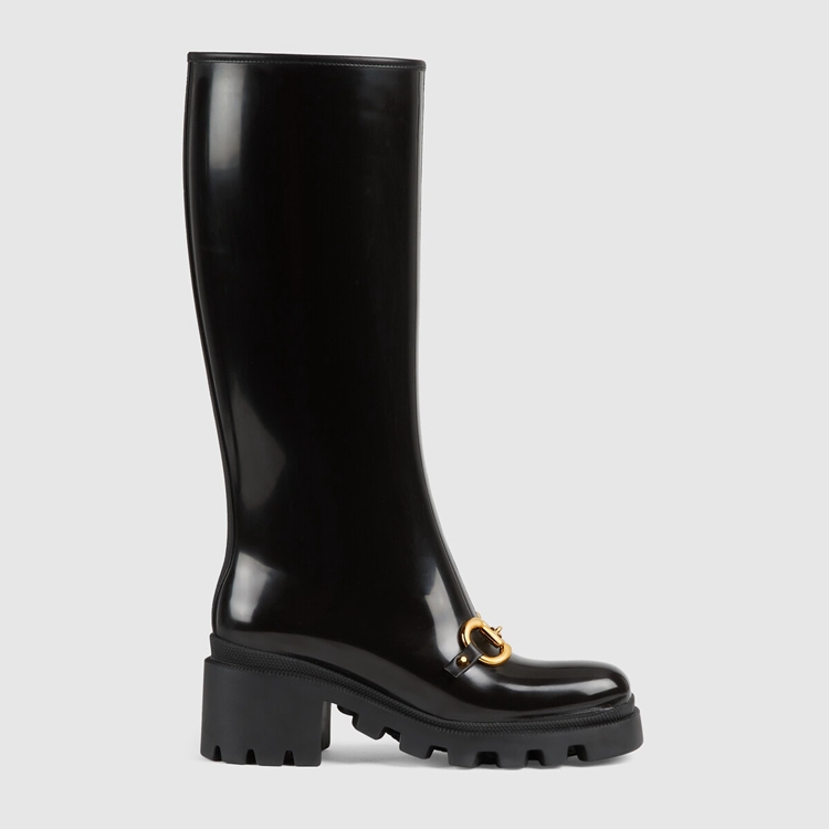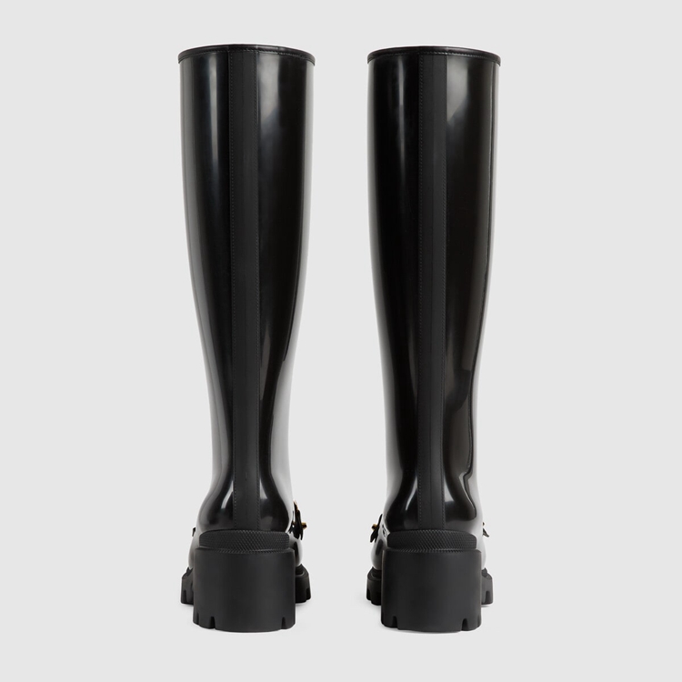 Style 659707 JCCP0 1000Rubber adds a playful, retro- Inspired note to essential designs. Presented in black, This pair of knee-high boots is accentuated by The Horsebit—an archival code that pays tribute to The House’s equestrian history. The design features details in Demetra. Created With The same processes used For tanning, The New material offers pliable and resilient performance With a supple finish. The eco-friendly material combines animal-free raw materials primarily from sustainable, renewable, and bio-based sources.