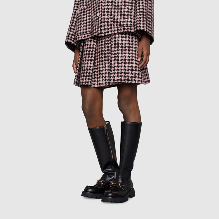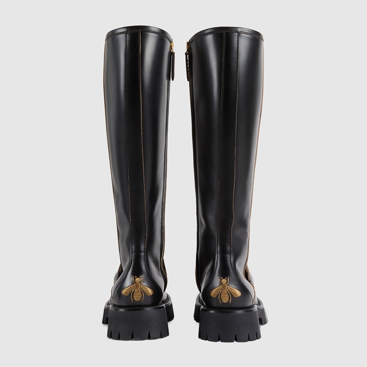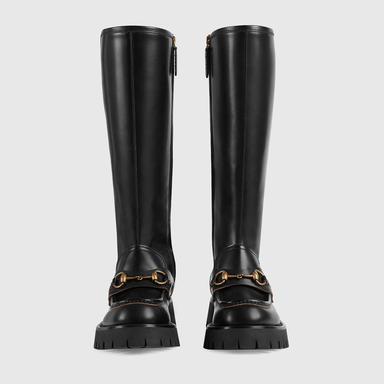 Style 670395 DS800 1000Contemporary styles take inspiration from equestrian accessories in a celebration of Gucci’s roots. This pair of knee-high leather boots recalls shoes For horse riding, a reference deepened by The gold-toned Horsebit. Adding an unexpected element, The style is completed by a chunky sole.