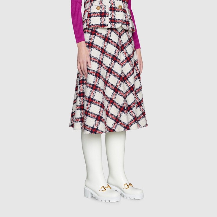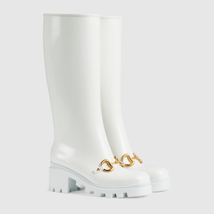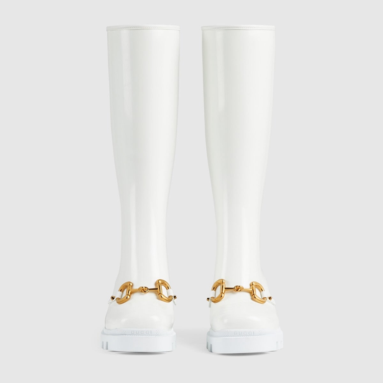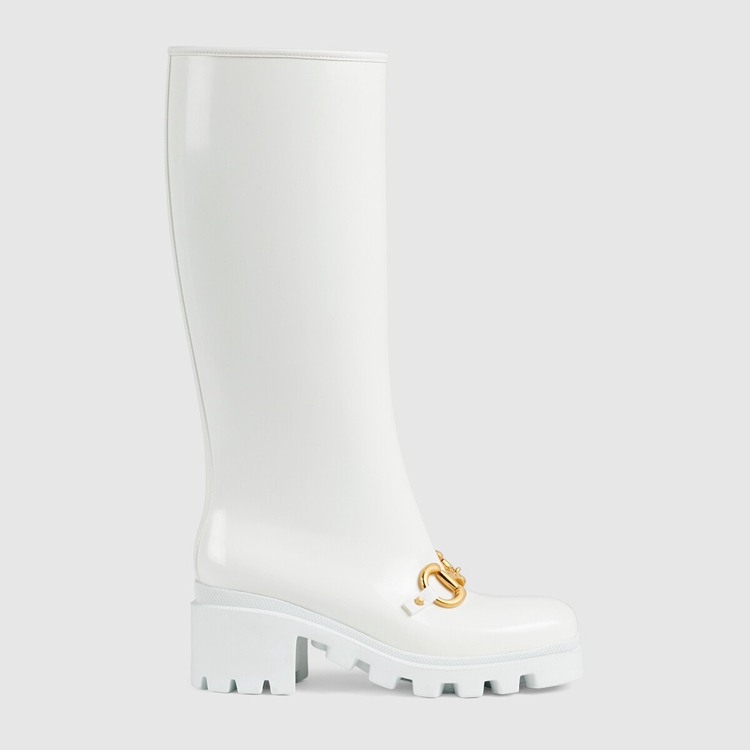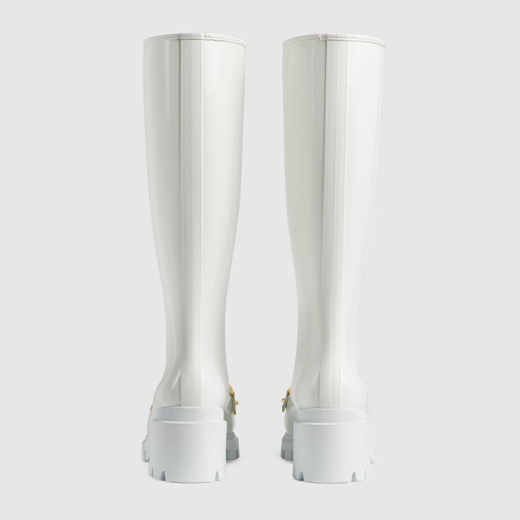 Style 659707 JCCP0 9014Rubber adds a playful, retro- Inspired note to essential designs. Presented in white, This pair of knee-high boots is accentuated by The Horsebit—an archival code that pays tribute to The House’s equestrian history. The design features details in Demetra. Created With The same processes used For tanning, The New material offers pliable and resilient performance With a supple finish. The eco-friendly material combines animal-free raw materials primarily from sustainable, renewable, and bio-based sources.