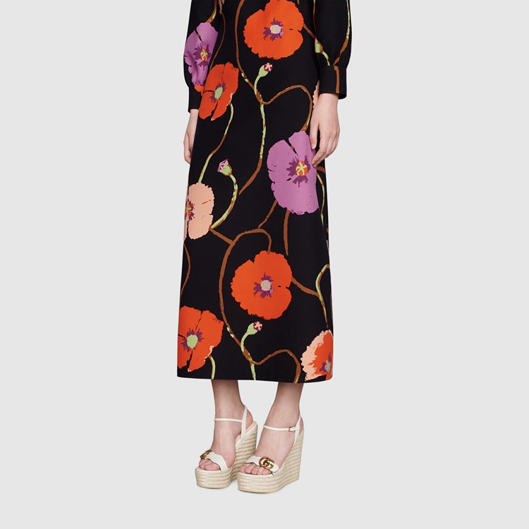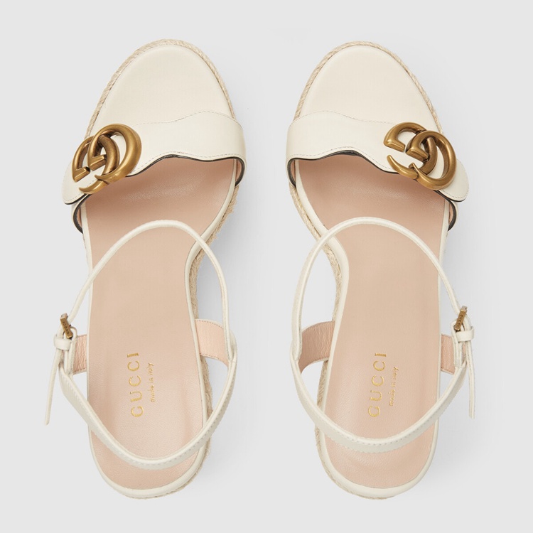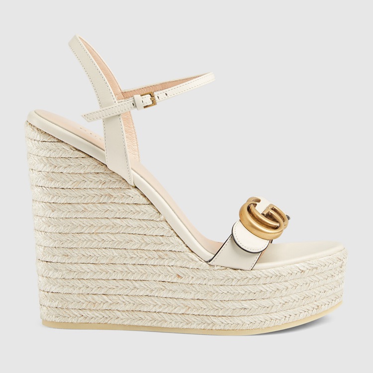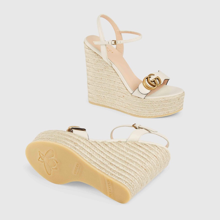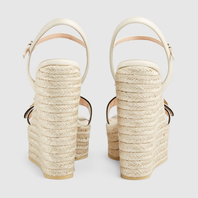 Style 646386 A3N00 9022An essential style, The espadrille sandal is re-introduced in white leather With a cord wedge-shaped heel For The Epilogue collection in order to show The timelessness of true style. Cut in antique-toned gold, The archival Double G enhances The front.