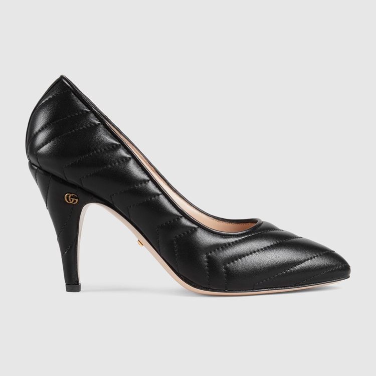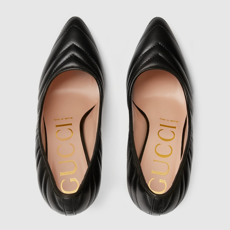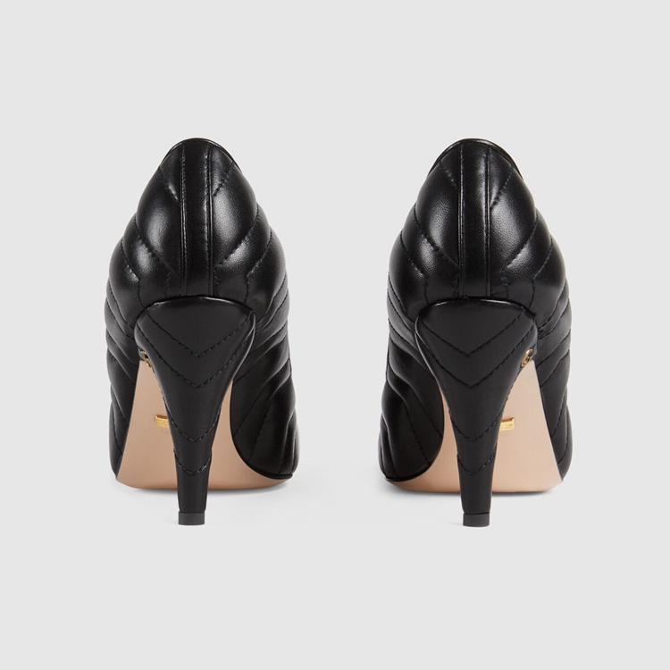 Style 658374 BKO00 1000 Emblematic of The House’s designs, This pair of pumps is Crafted from black matelassé leather With a chevron motif. A miniature version of Guccio Gucci’s monogram appears as a hardware detail at The heel, adding a subtle logo touch.