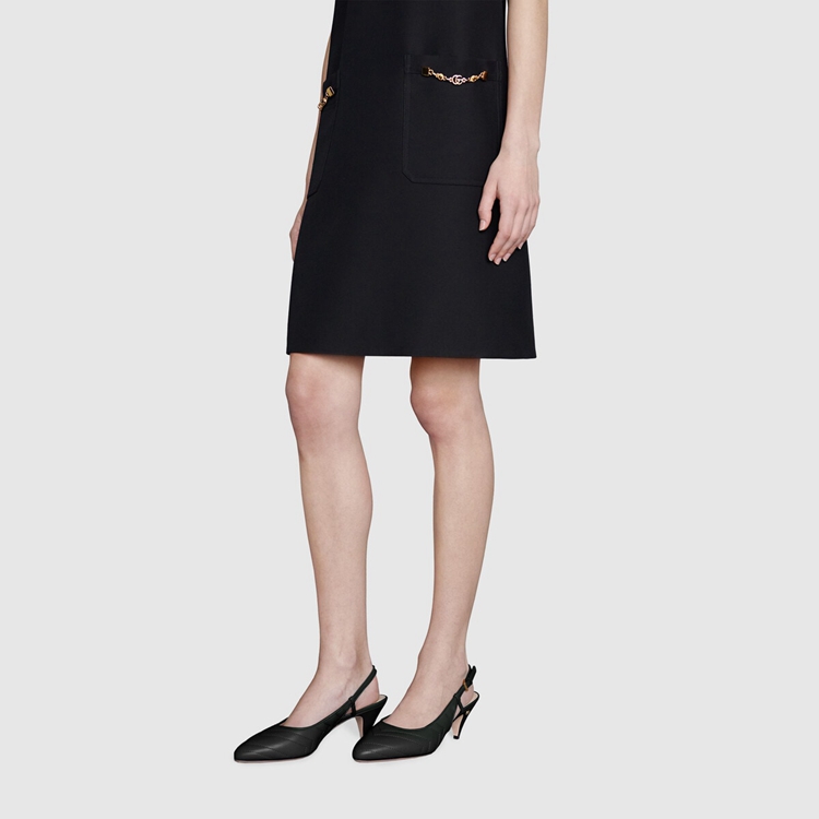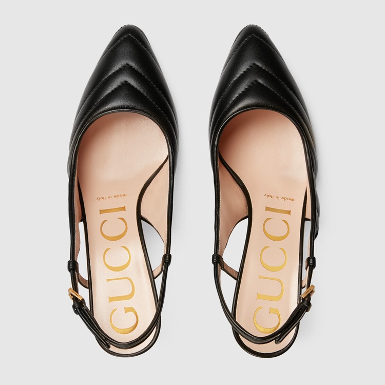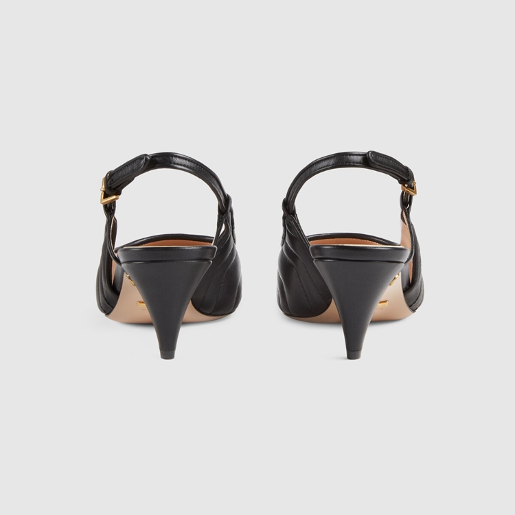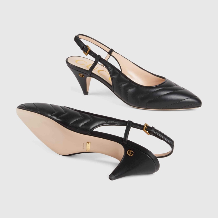 Style 659471 BKO00 1000 Emblematic of The House’s designs, This pair of sling back pumps is Crafted from black matelassé leather With a chevron motif. A miniature version of Guccio Gucci’s monogram appears as a hardware detail at The heel, adding a subtle logo touch.