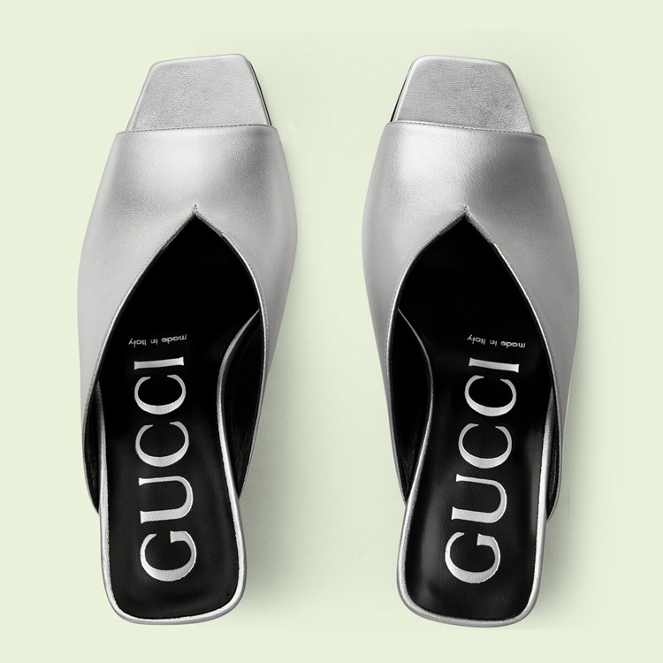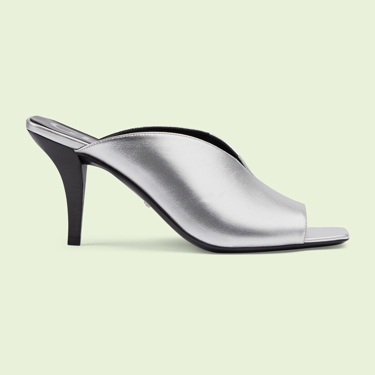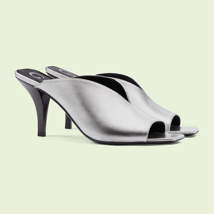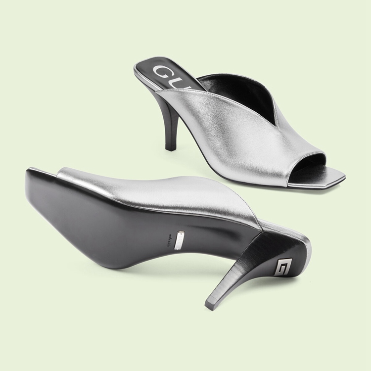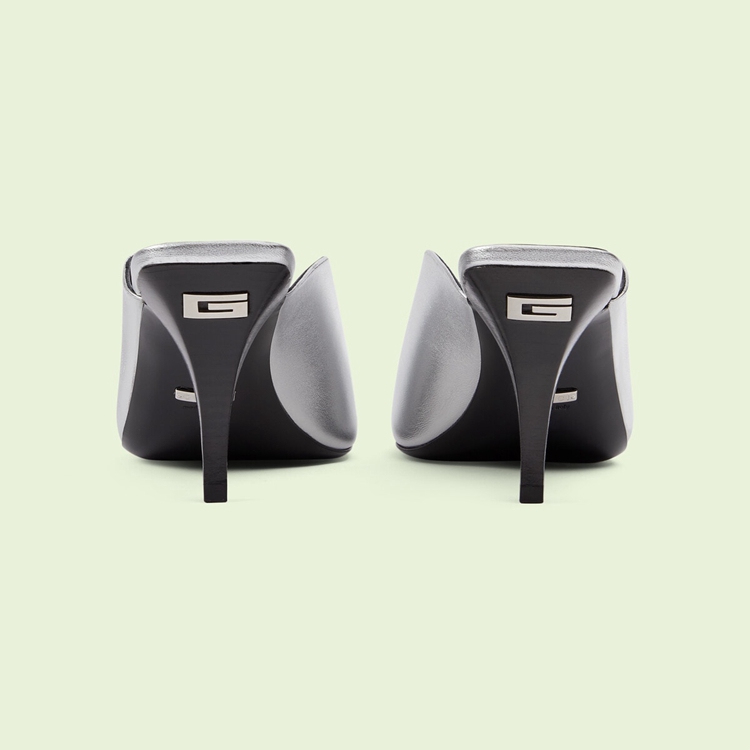 Style 695309 B8B00 8106An ode to The energy of The glam rock scene, This pair of mid-heel pumps is presented in metallic leather. The pair of silver shoes are further defined by a unique v-shape silhouette, bringing The House’s inventive nature to The fore.