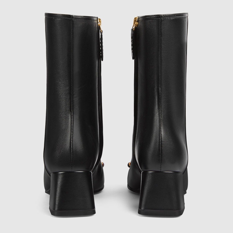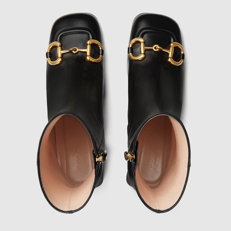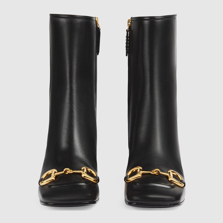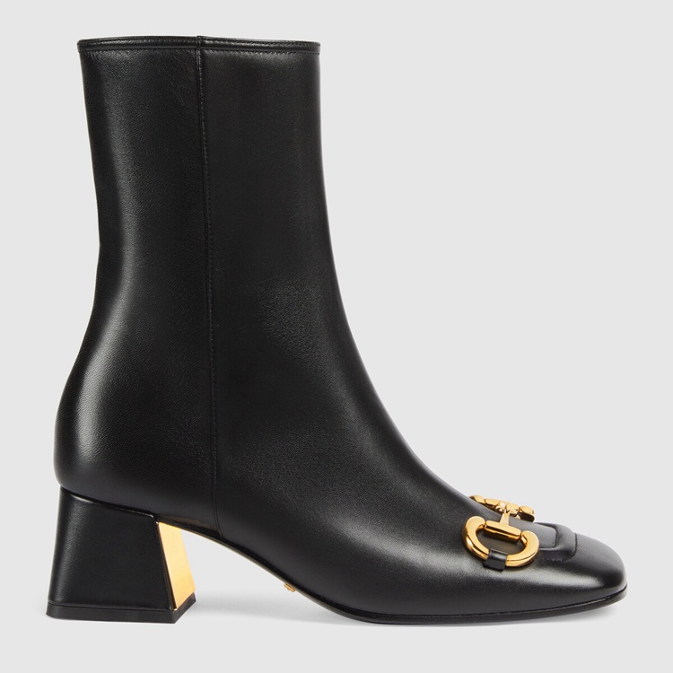 Style 643888 BKO00 1000 A historic symbol of The House, The Horsebit is presented on an ankle boot in smooth black leather. A sculpted block heel and a square shaped toe add a refined touch to The style.