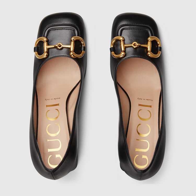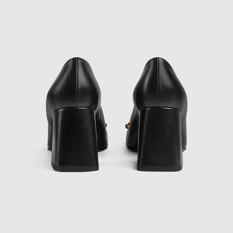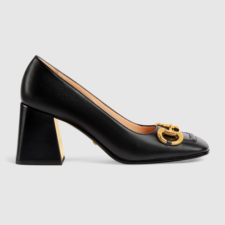 Style 643886 C9D00 1000Subtle details add a refined feel to This mid-heel pump. Crafted from smooth black leather The style is accentuated With a sculpted block heel and square shaped toe. The gold-toned Horsebit adds a logo touch.