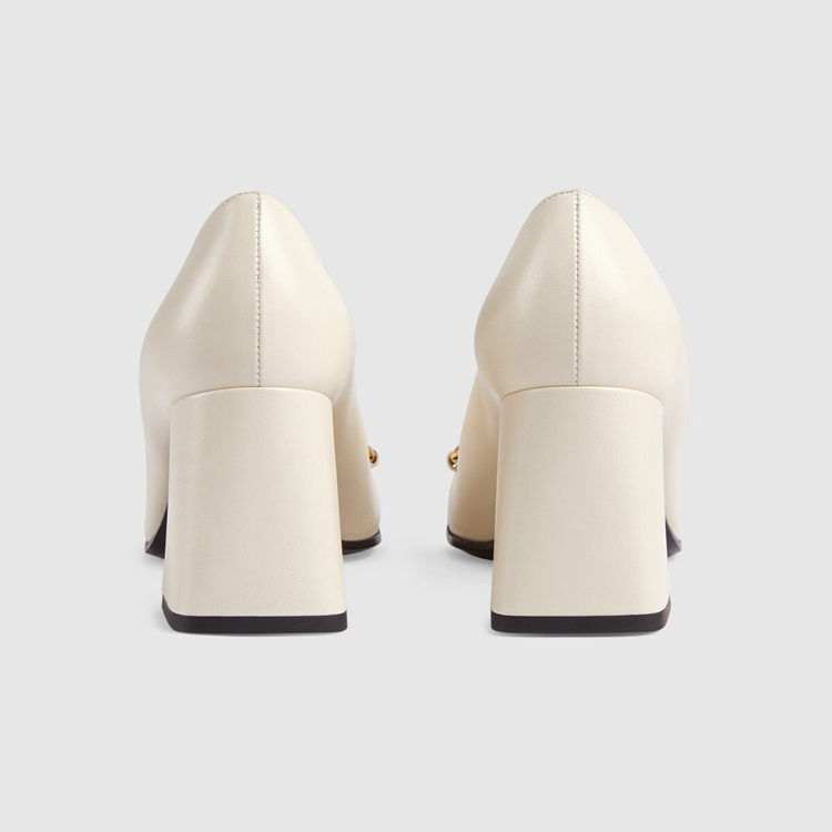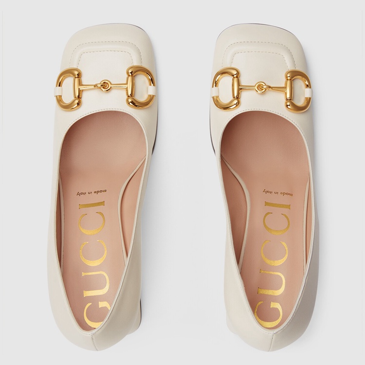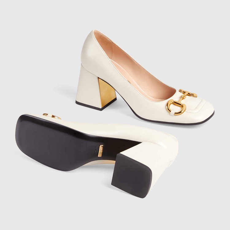 Style 643886 C9D00 9022Subtle details add a refined feel to This mid-heel pump. Crafted from smooth white leather The style is accentuated With a sculpted block heel and square shaped toe. The gold-toned Horsebit adds a logo touch.
