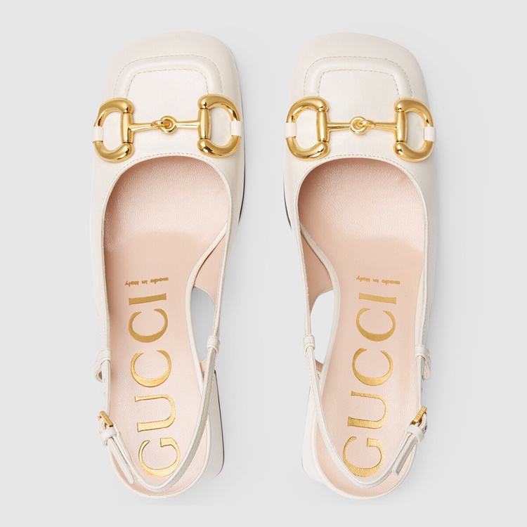 Style 643892 C9D00 9022 A slingback pump With vintage accents like a square shaped toe and sculpted block heel. The style is presented in white leather. The Horsebit detail, a code from The archives, connects The style to The House’s equestrian roots.