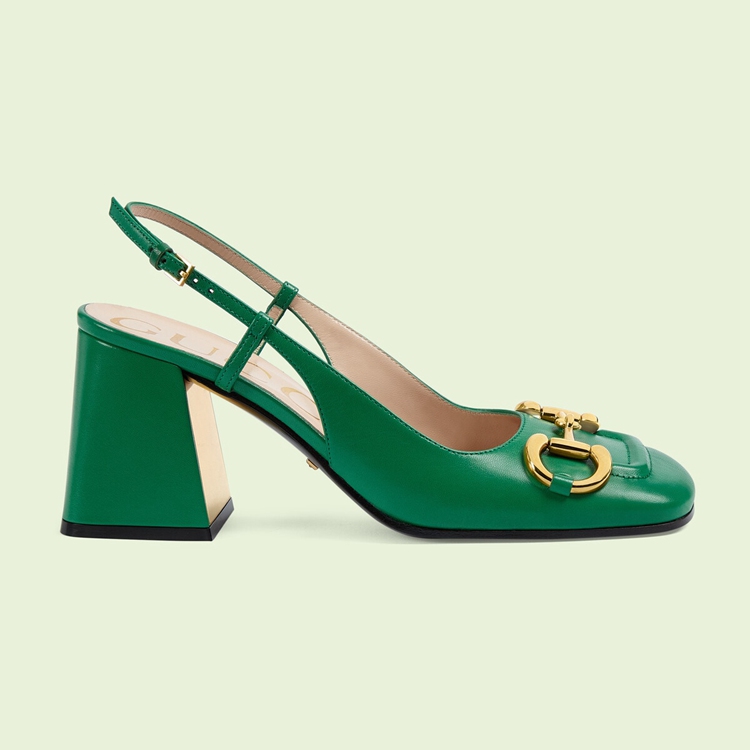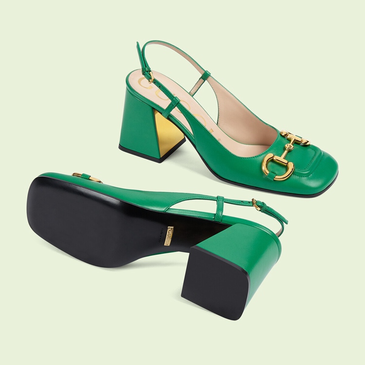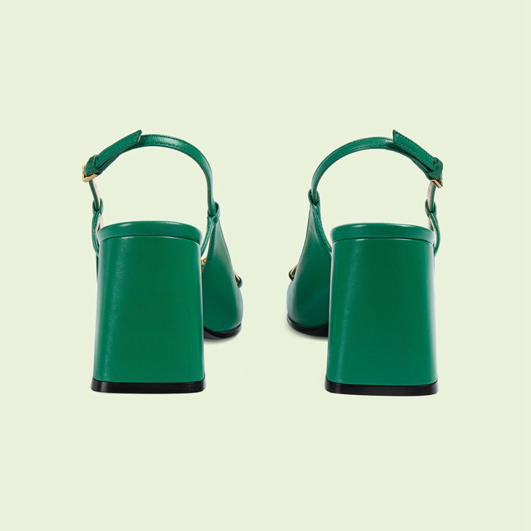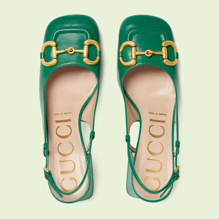 Style 643892 C9D00 3727 A nod to The House’s equestrian past, The Horsebit has become both a historical and contemporary emblem throughout The years. From jacquards to prints and hardware appearing in both past and recent collections, it is an unmistakable piece that tells The story of The brand. Here, The double ring and bar decorates a pair of green leather slingbacks.