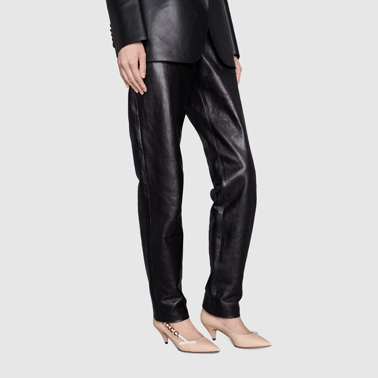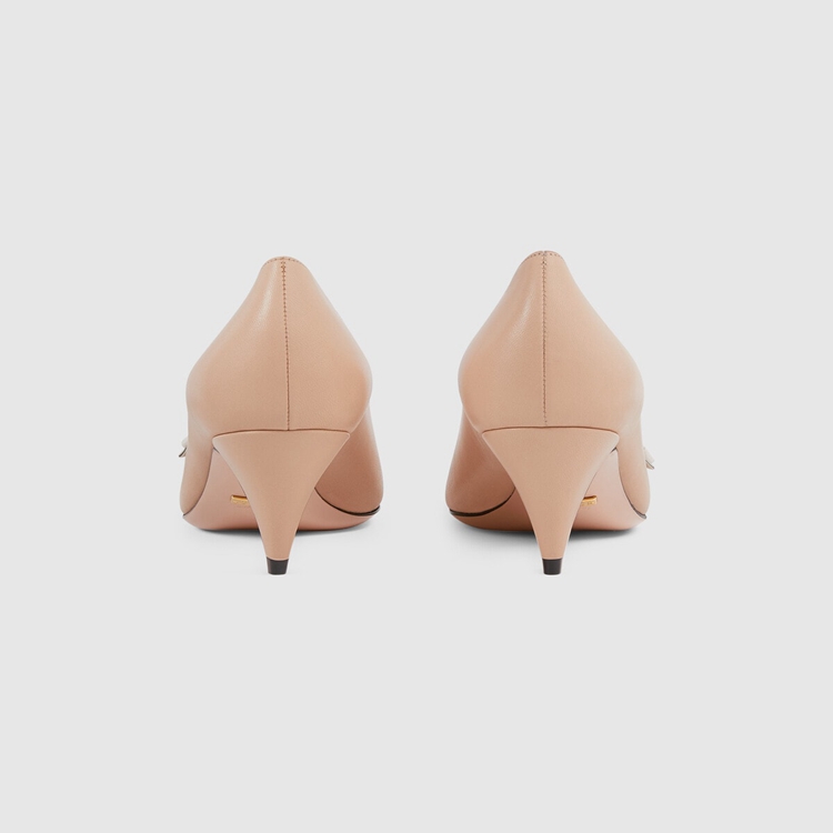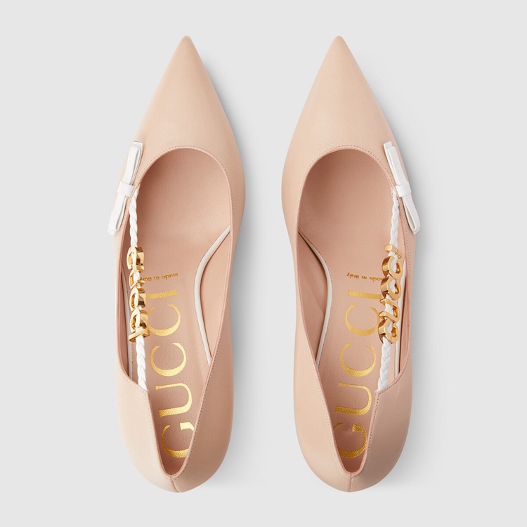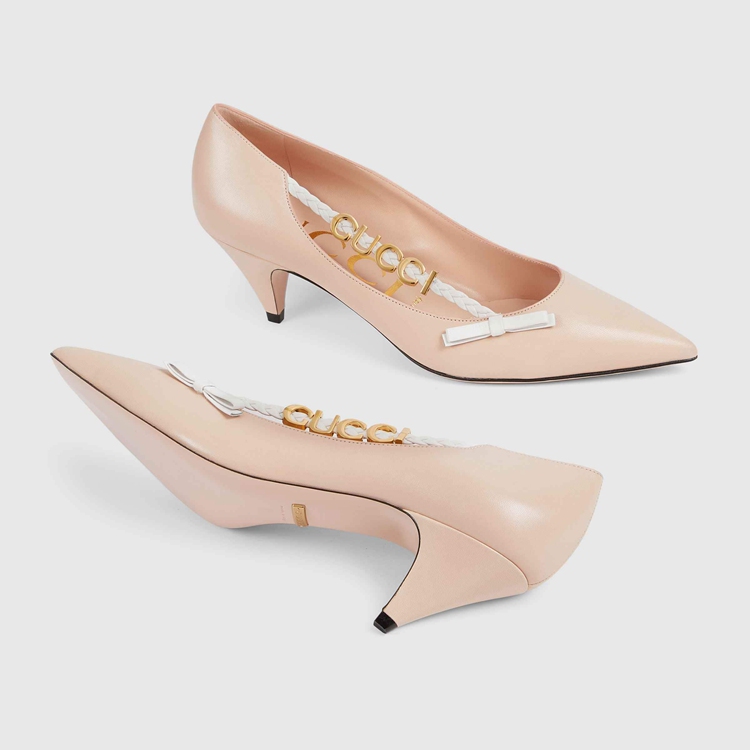 Style 674773 C9D10 6762Subtle details combine to imbue This pump With a vintage feel. Reminiscent of Designs popular in The ’50s, The pink leather shoe has been designed With a kitten heel. The style is further completed by an intricate braided detail With ‘ Gucci’ hardware.