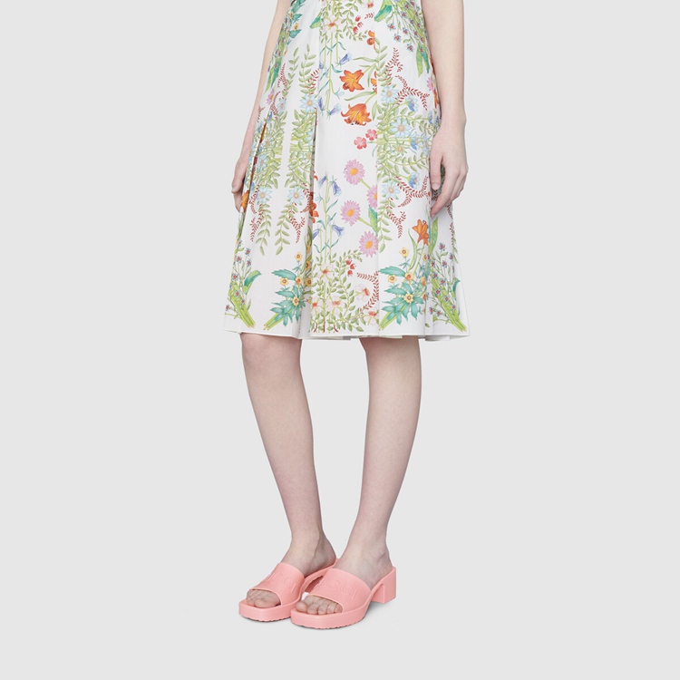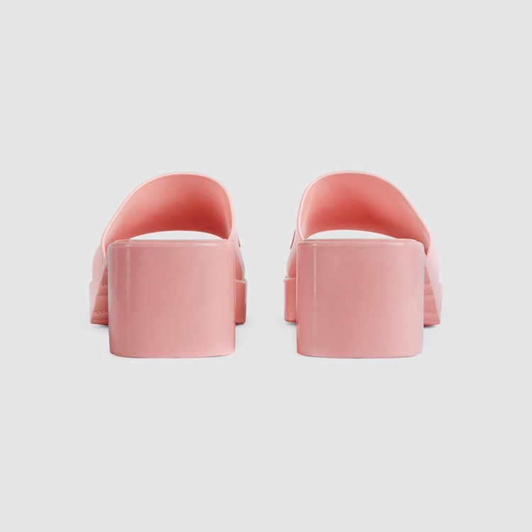 Style 624730 J8700 5815 A playful twist on an essential style, The slide sandal is presented in a delicate shade of pink rubber For The Pre-Fall 2020 collection. Recalling ’90s style, a chunky heel and embossed logo add a Retro appeal.