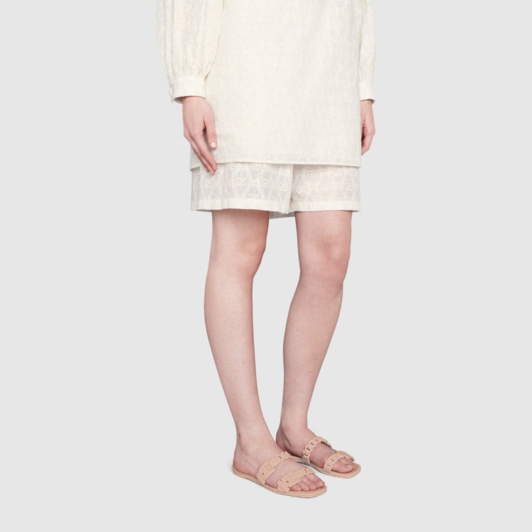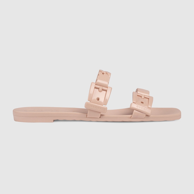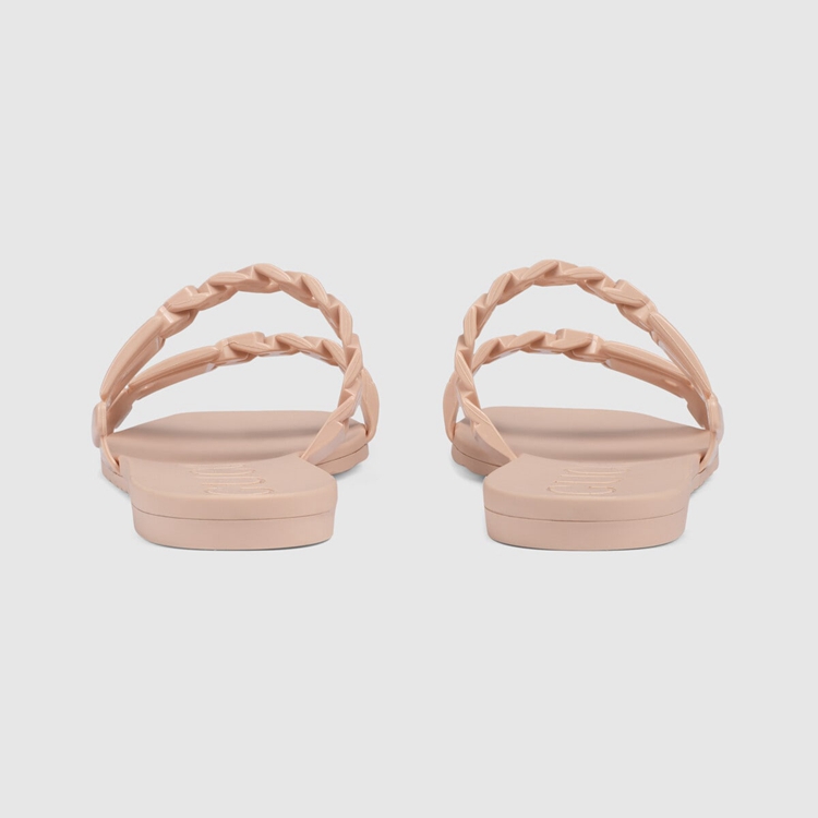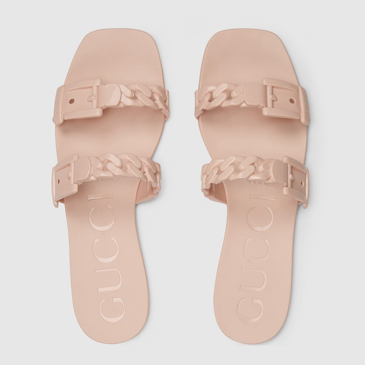 Style 624731 J8700 5909 A playful twist on an essential style, The slide sandal is presented in light pink rubber For The Pre-Fall 2020 collection. The slimline silhouette is enhanced by chain details.