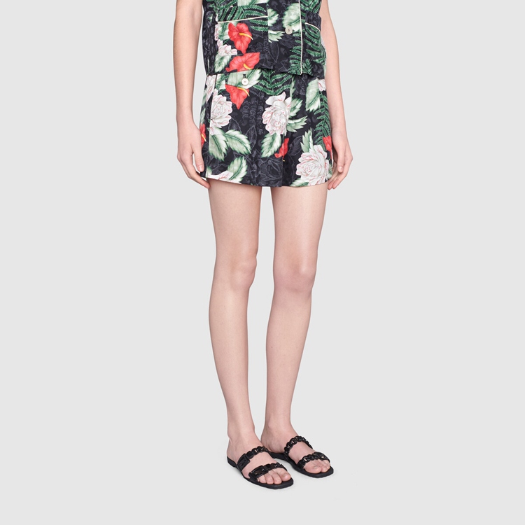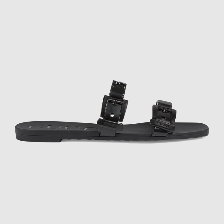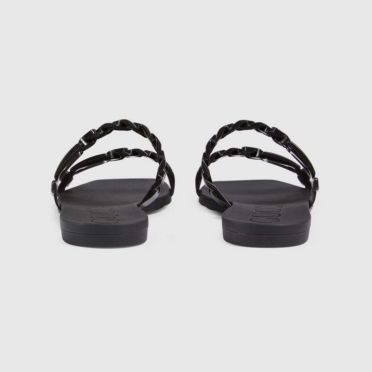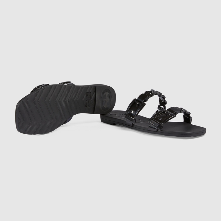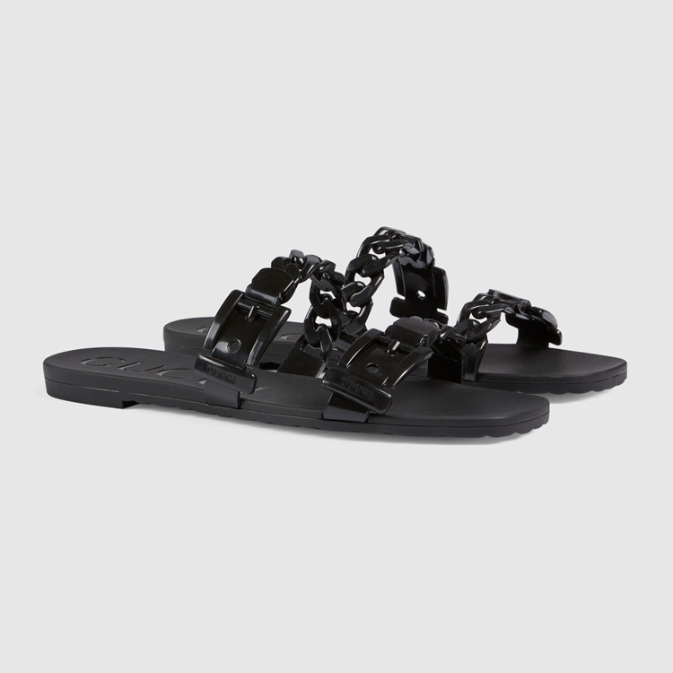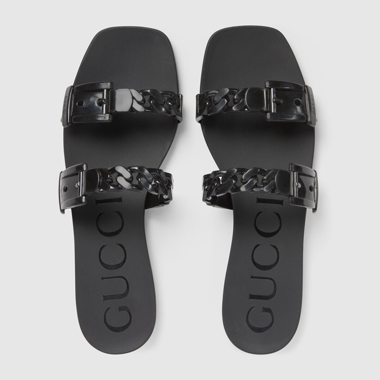 Style 624731 J8700 1000 A playful twist on an essential style, The slide sandal is presented in black rubber For The Pre-Fall 2020 collection. The slimline silhouette is enhanced by chain details.
