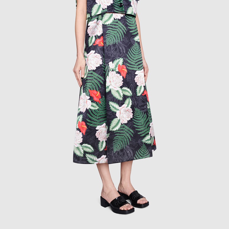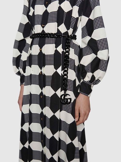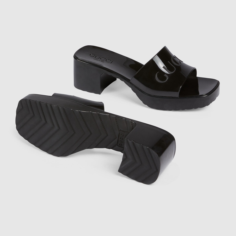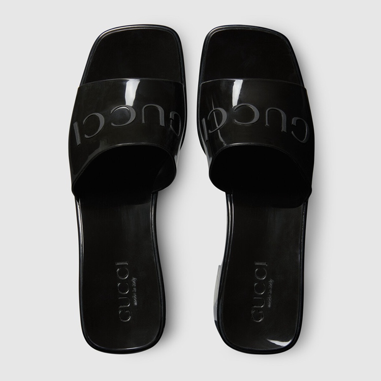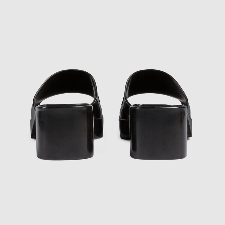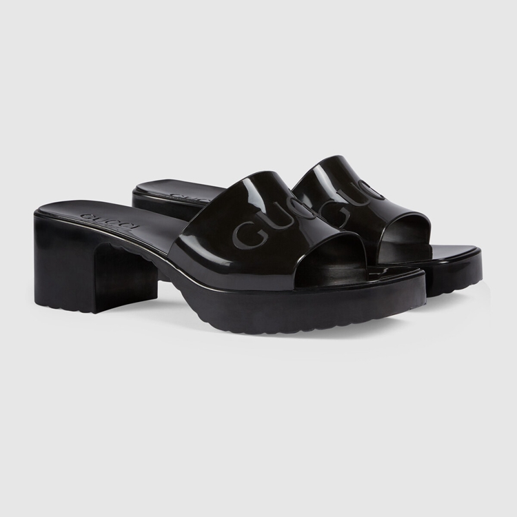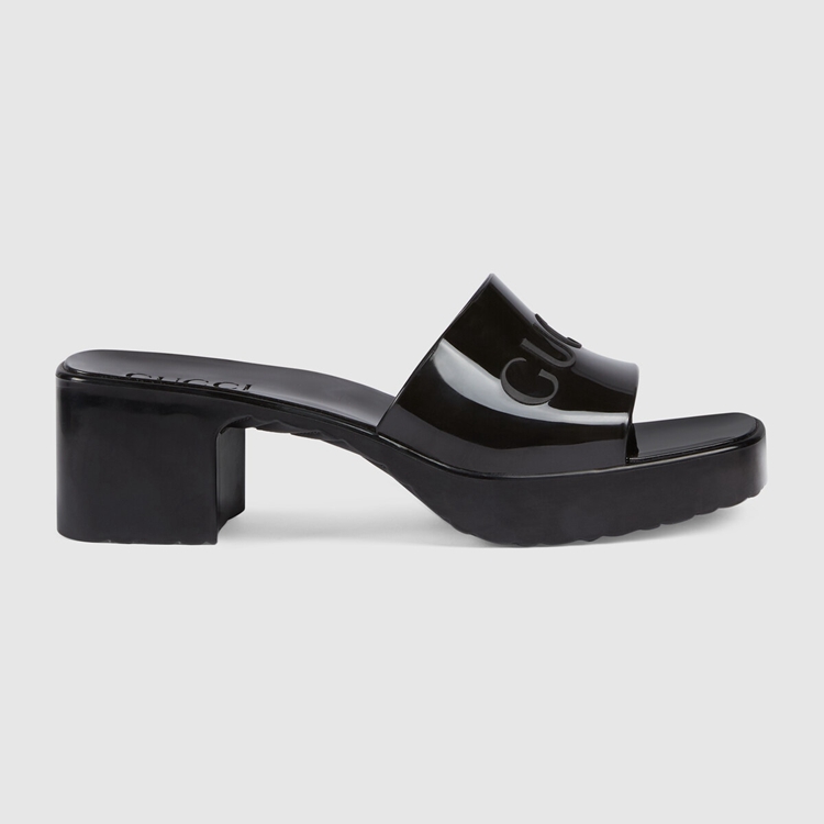 Style 624730 J8700 1000 A playful twist on an essential style, The slide sandal is presented in black rubber For The Pre-Fall 2020 collection. Recalling ’90s style, a chunky heel and embossed logo add a Retro appeal.