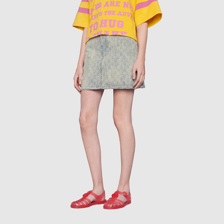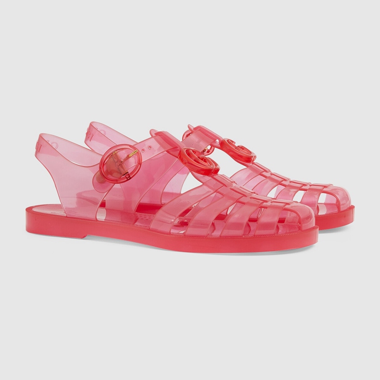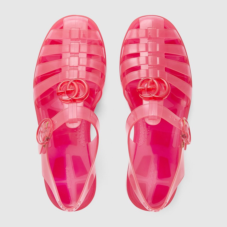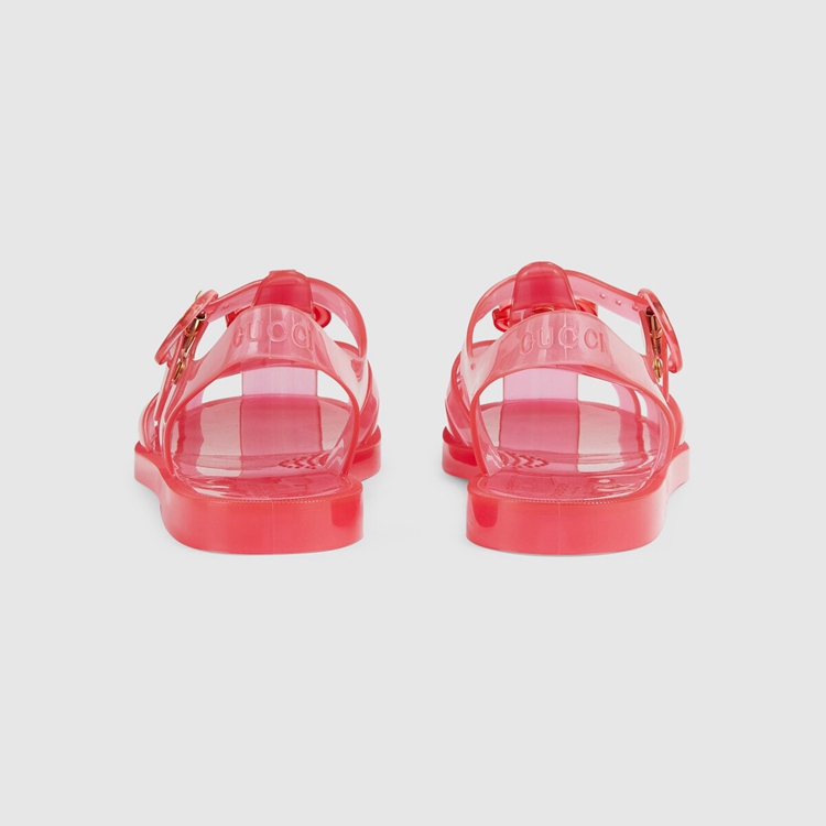 Style 676970 JFM00 6656 Recalling playful styles from The ’90s, This sandal is presented in orange rubber With a transparent finish. The shoe is distinguished by tonal Double G hardware and The name of The House at The back of The ankle strap, creating a link to The logomania trend that characterized This era.