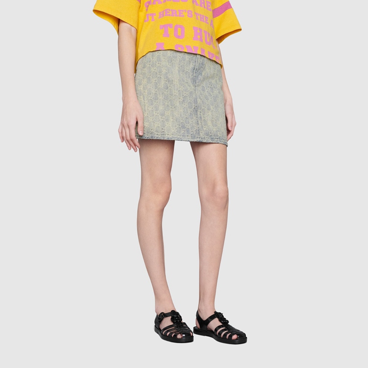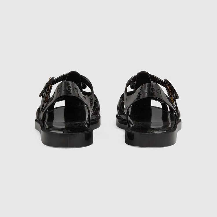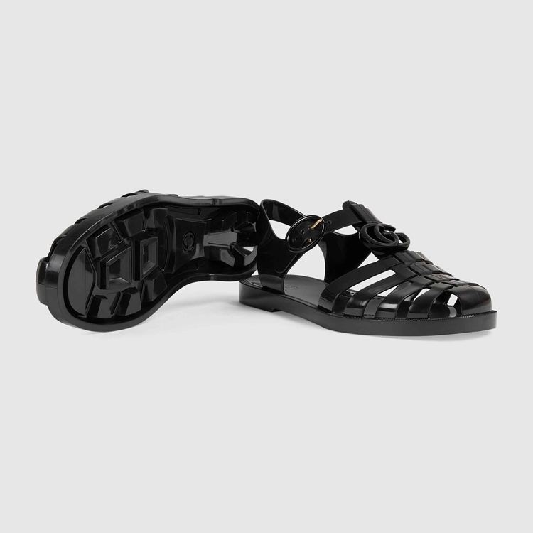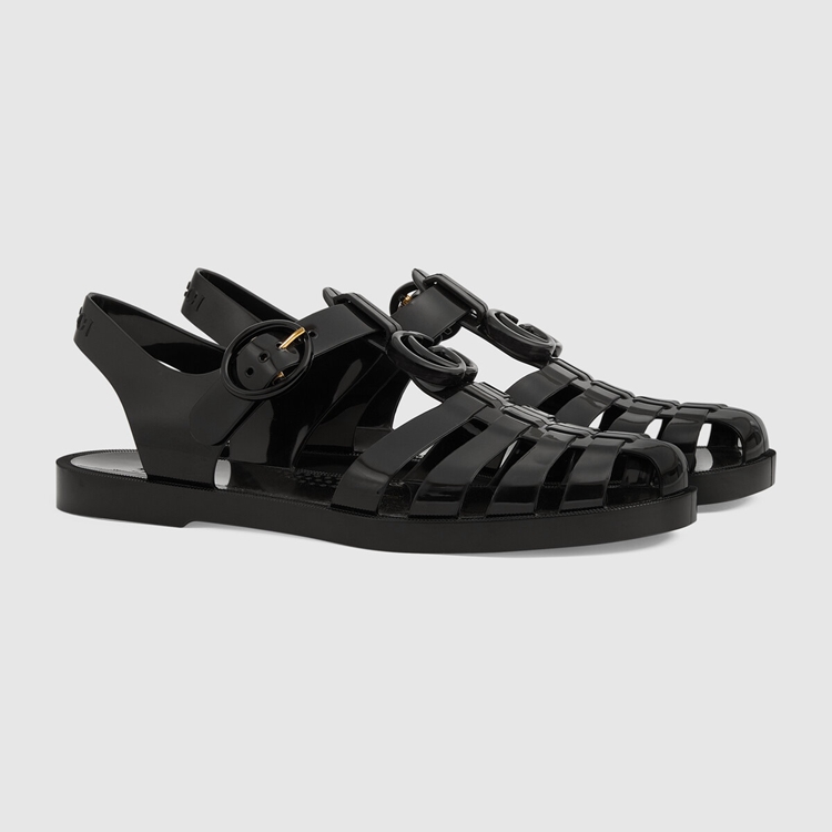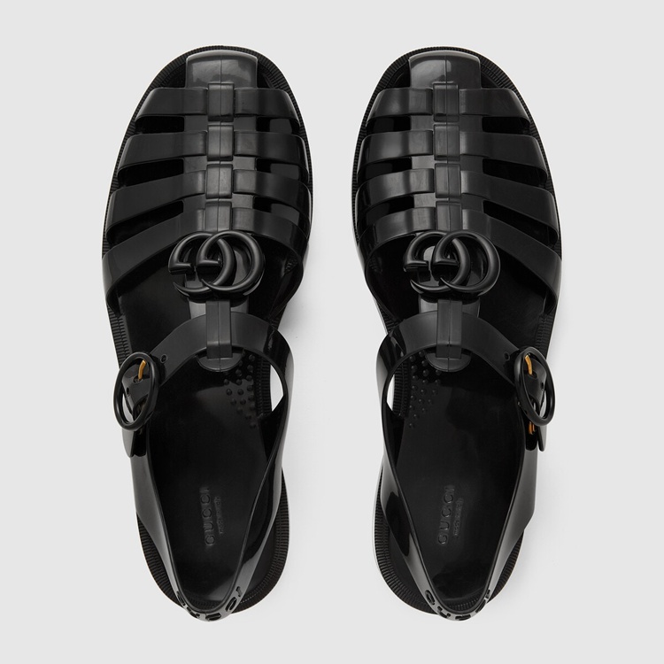Style 676971 JFM00 1000 Recalling playful styles from The ’90s, This sandal is presented in black rubber With a shiny finish. The shoe is distinguished by tonal Double G hardware and The name of The House at The back of The ankle strap, creating a link to The logomania trend that characterized This era.