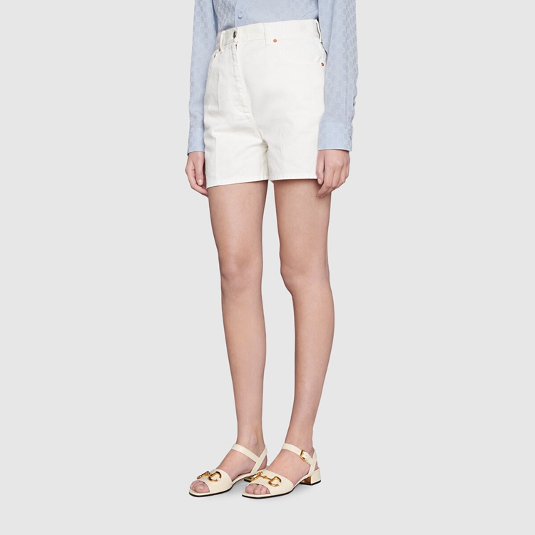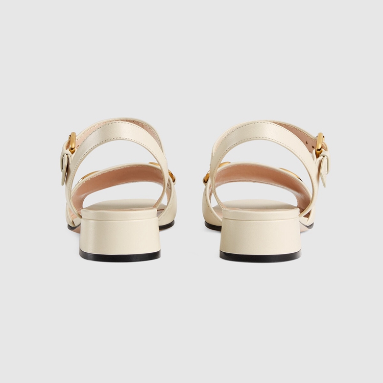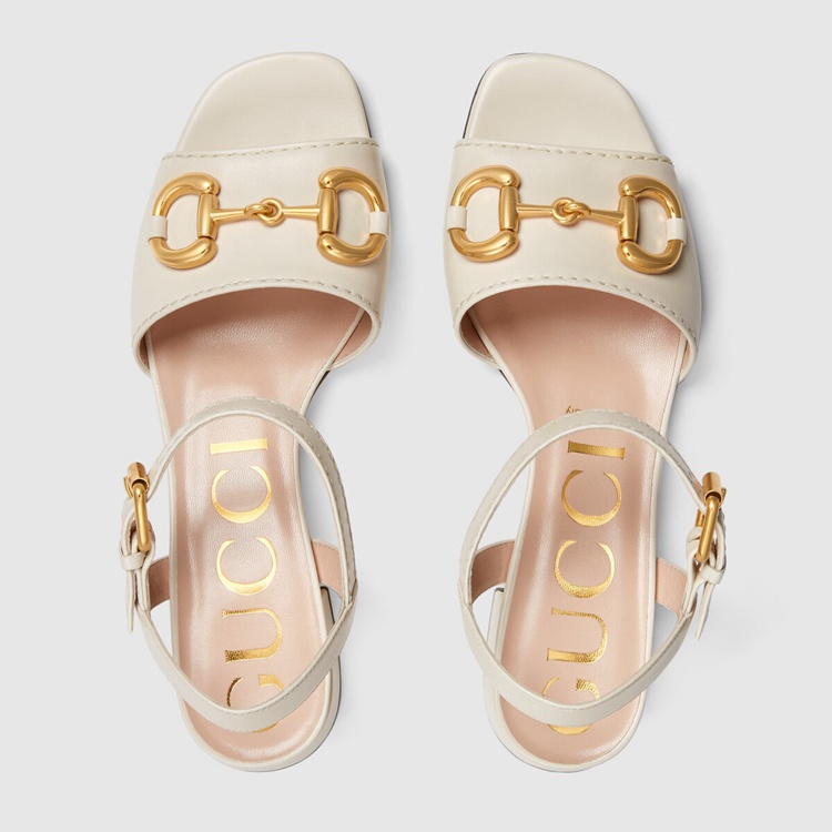 Style 655413 BKO00 9022An open-toed sandal in white leather defined by The House’s Emblematic Horsebit hardware. The double ring and bar design appears throughout The Ouverture collection as a reference to Gucci’s origins.