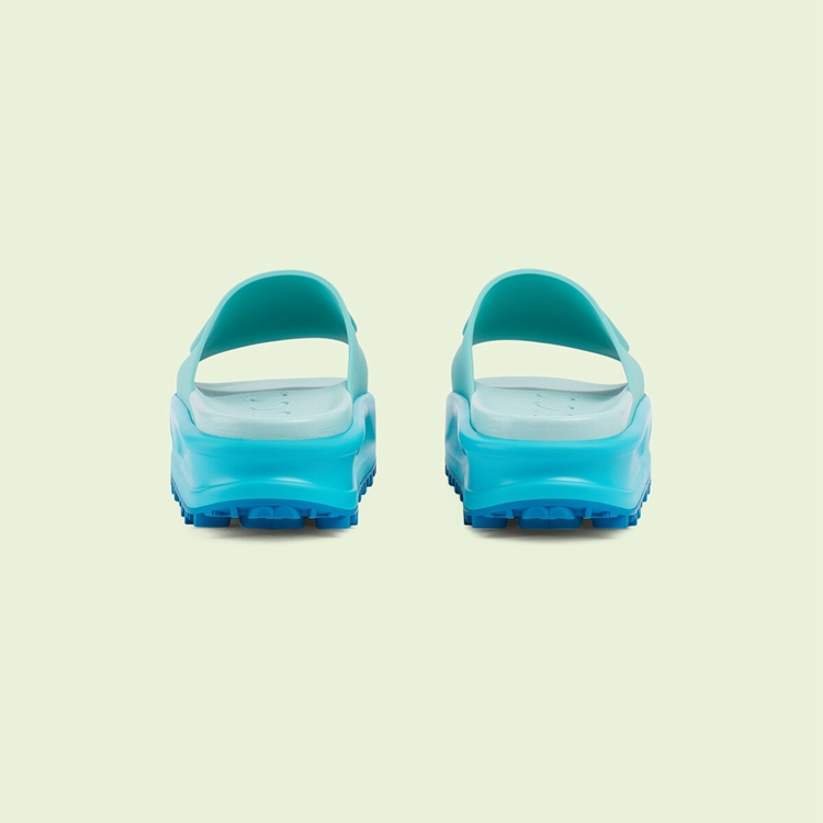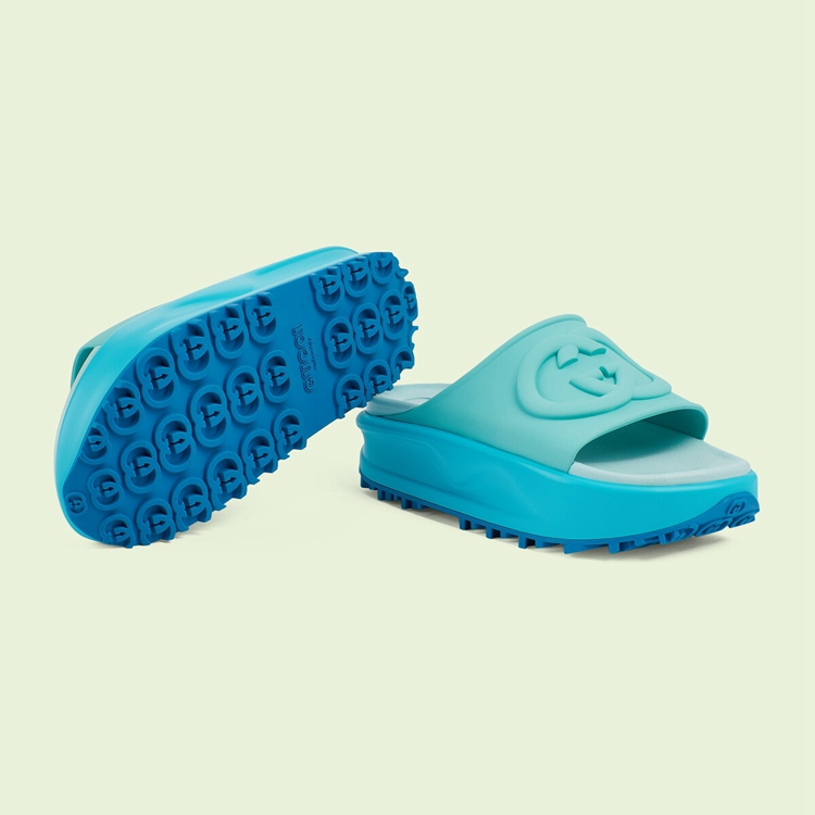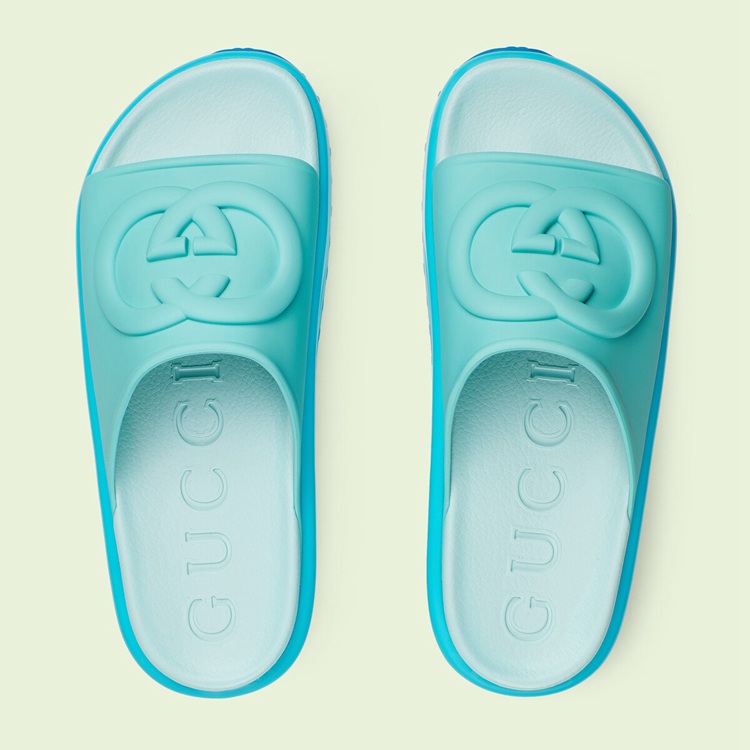 Style 692845 JF000 3922Intrinsically linked to The ’90s, rubber adds a Retro note to The latest collections. This pair of slide sandals accentuates The aesthetic With an embossed Interlocking G detail and turquoise Color palette.
