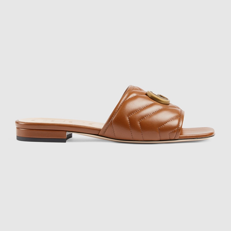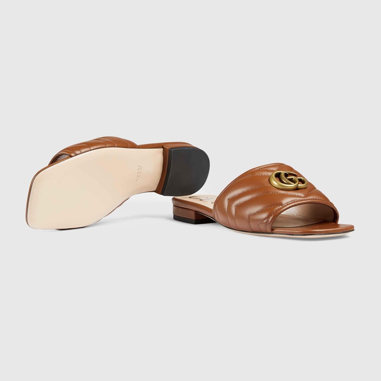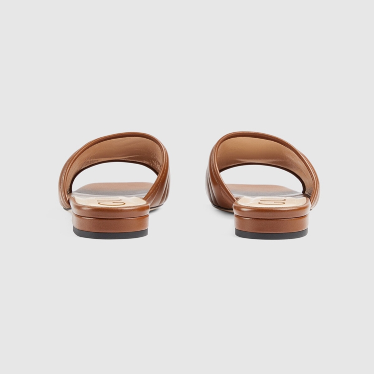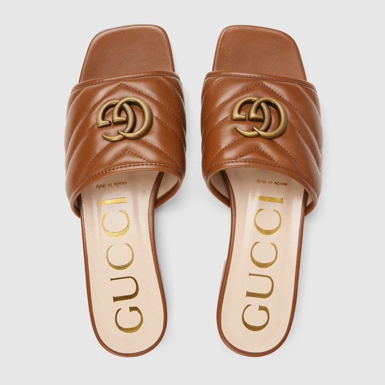 Style 646169 BKO60 2535 A slide sandal With a strong logo feel. First used in The 1970s, The GG logo was an evolution of The original Gucci rhombi design from The 1930s, and from then it’s been an established symbol of Gucci’s heritage. Every season, The historic motif evolves With New interpretations and twists, like With These brown matelassé leather slides.