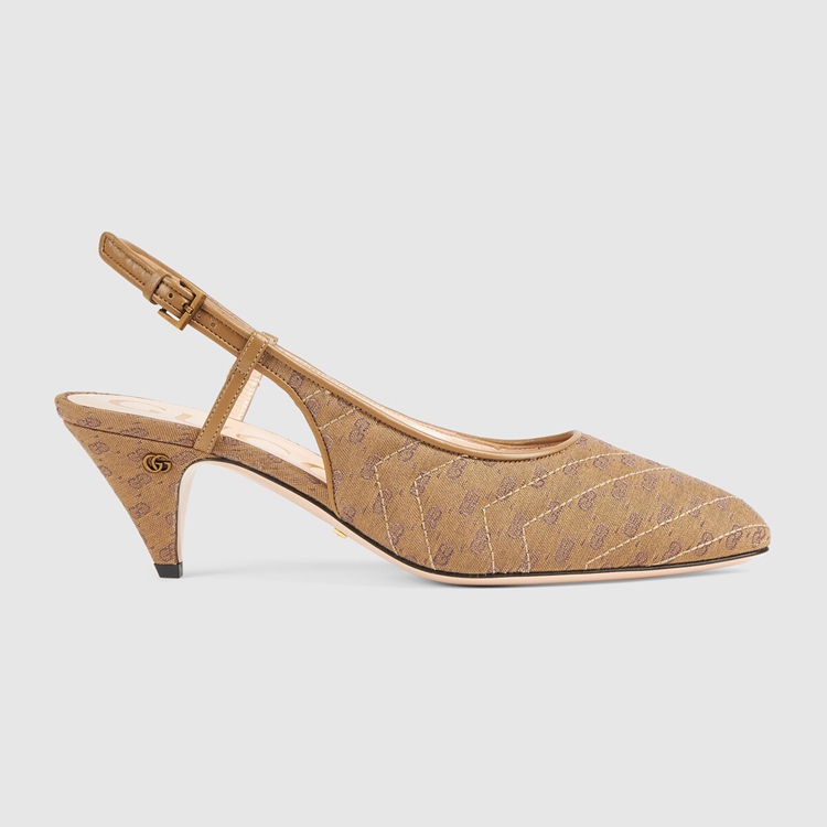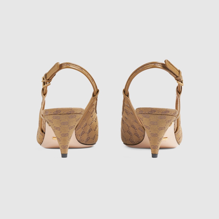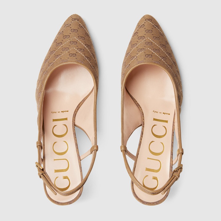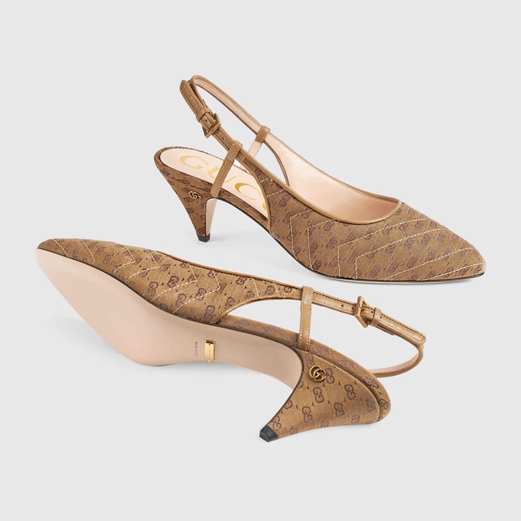 Style 658280 99WO0 2621 Crafted from Supreme canvas, This pair of sling back pumps is animated by a miniature version of Guccio Gucci’s monogram. Appearing as both a motif and gold-toned hardware, The logo infuses The style With a strong logo feel.