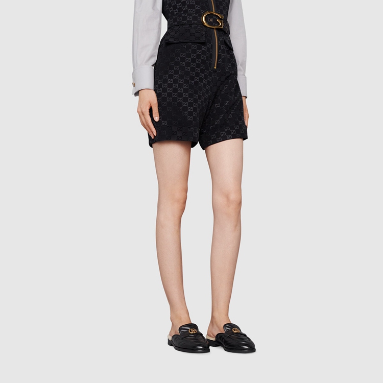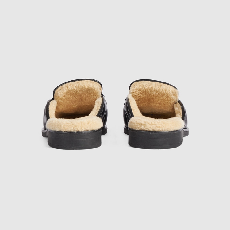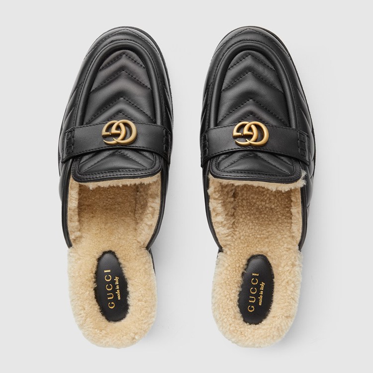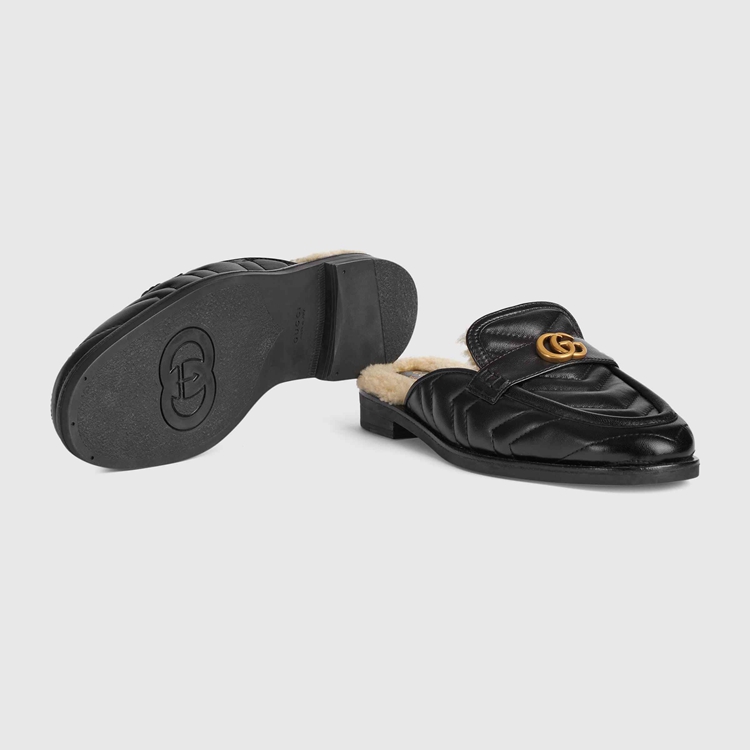 Style 670400 0CGG0 1061Textures and colors combine to reinvent The House’s slipper. Crafted from black chevron matelassé leather, The shoe is completed by Guccio Gucci’s gold-toned monogram hardware.