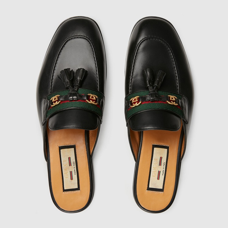 Style 659628 1W610 1066 The slipper has become an Emblematic Gucci design. Here, The style is presented in shiny black leather and defined by logo details. Both referencing The origins of The House, The Interlocking G is paired With The equestrian Inspired Web stripe.