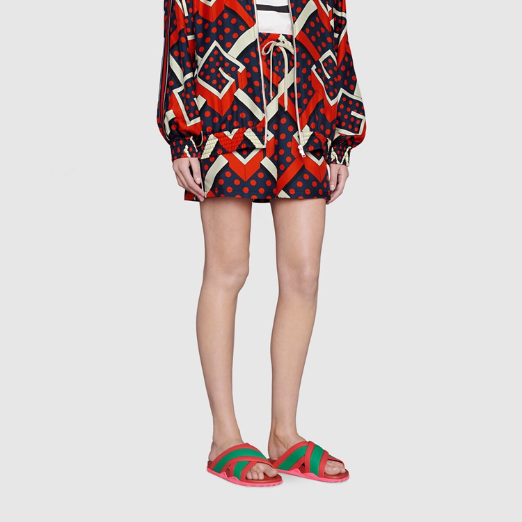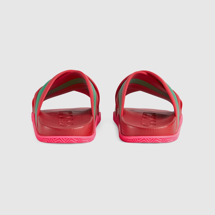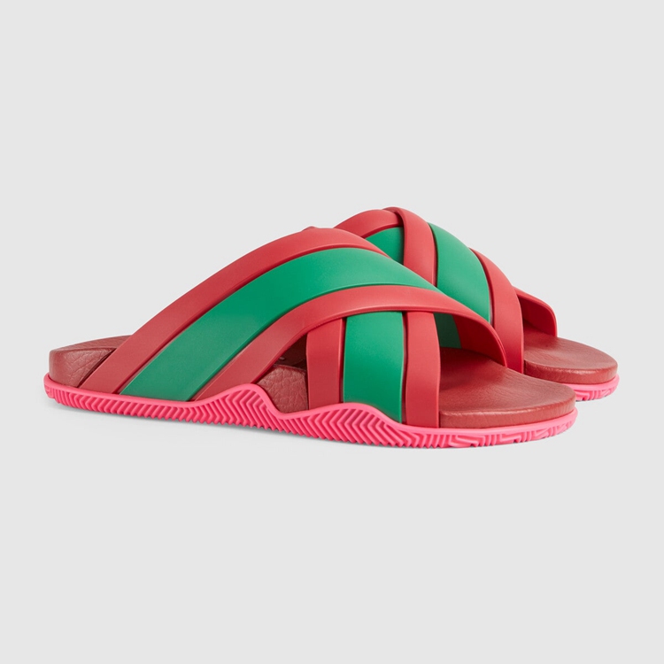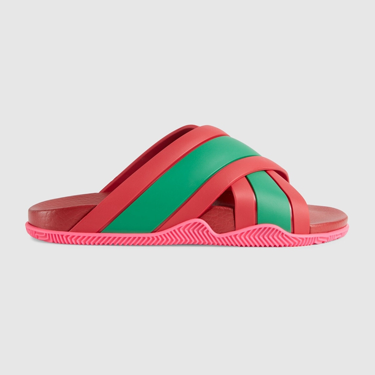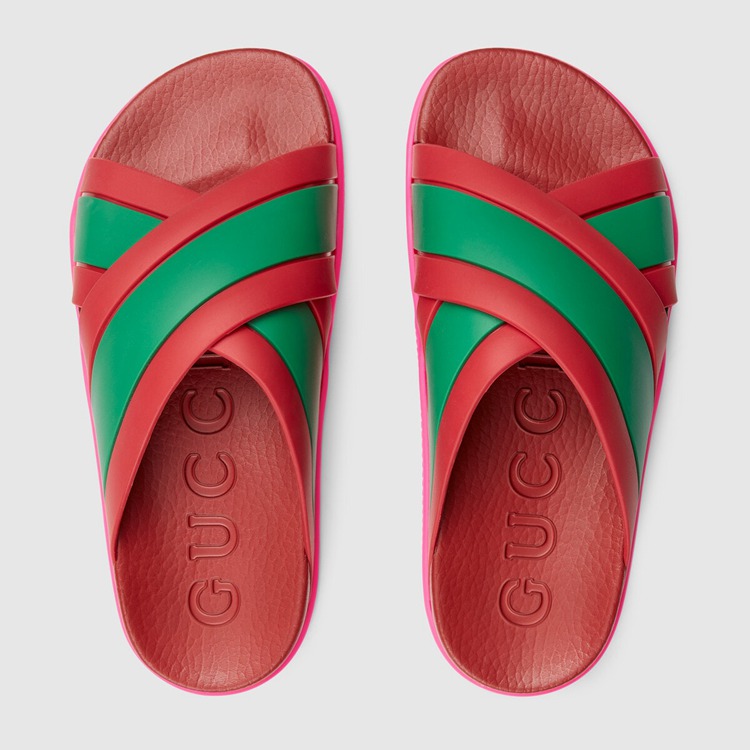 Style 627820 J8700 6559 The House Web is reimagined as a rubber slide sandal With a contemporary feel. Taken from The archives, The green and red stripes are a celebration of Gucci’s equestrian roots.