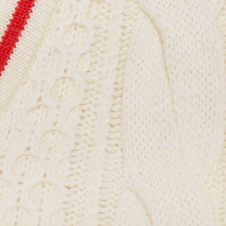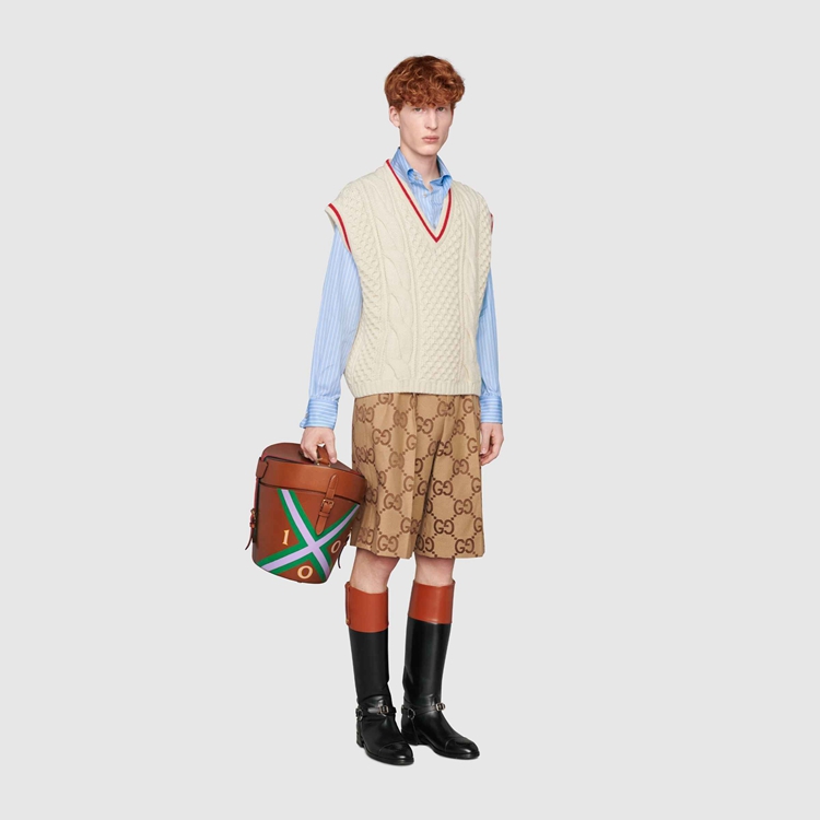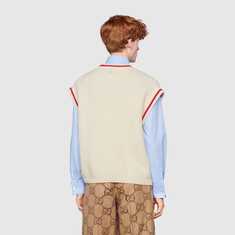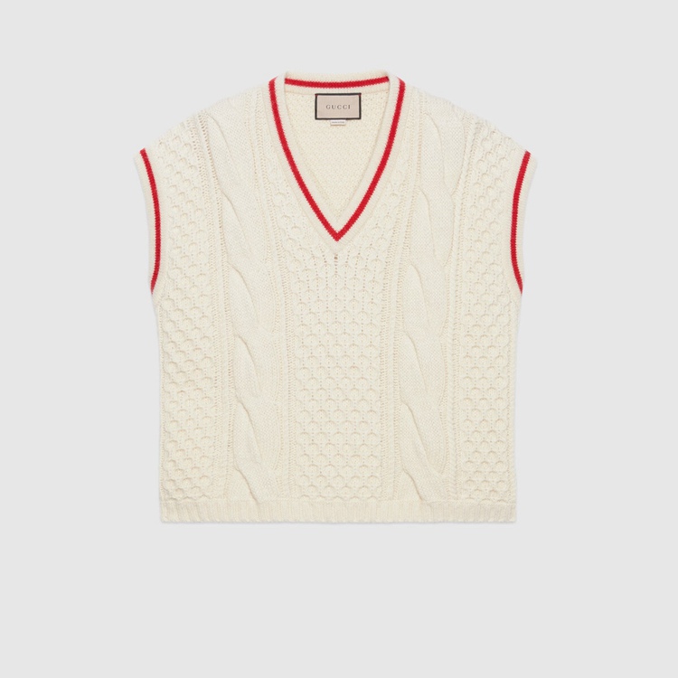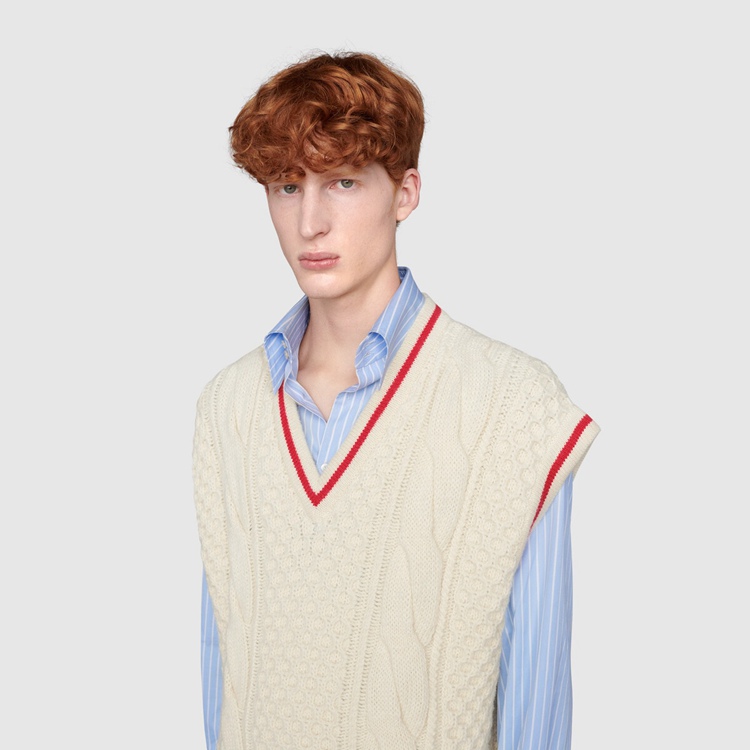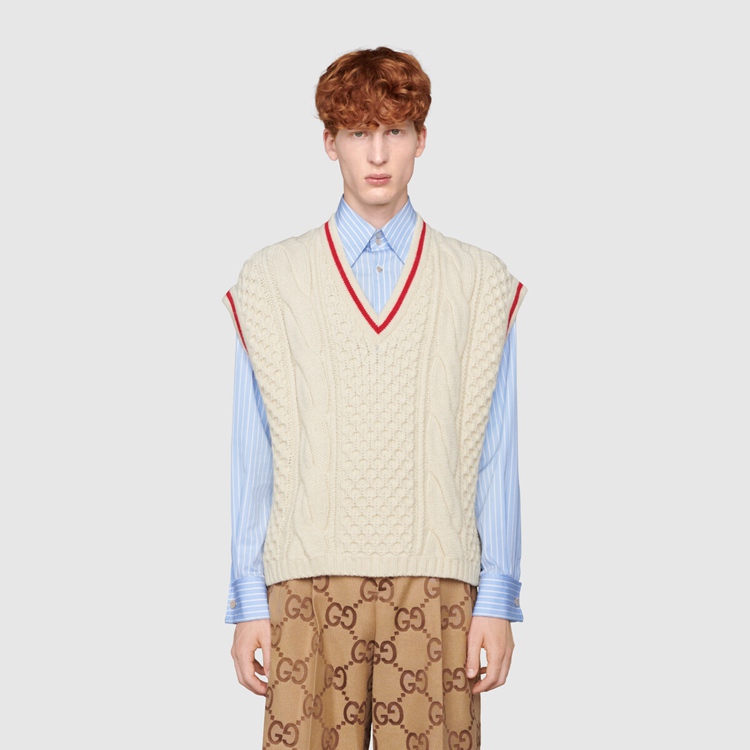 Style 673687 XKB22 9118 A chunky cable knit oversize cardigan has bold stripes in colors that are reminiscent of The Web. The preppy influence, a style that can be traced back to The Ivy League schools in The Northeast United States, continues to characterize The Gucci narrative.