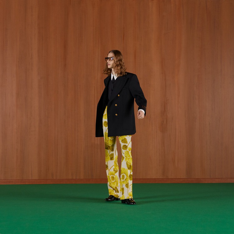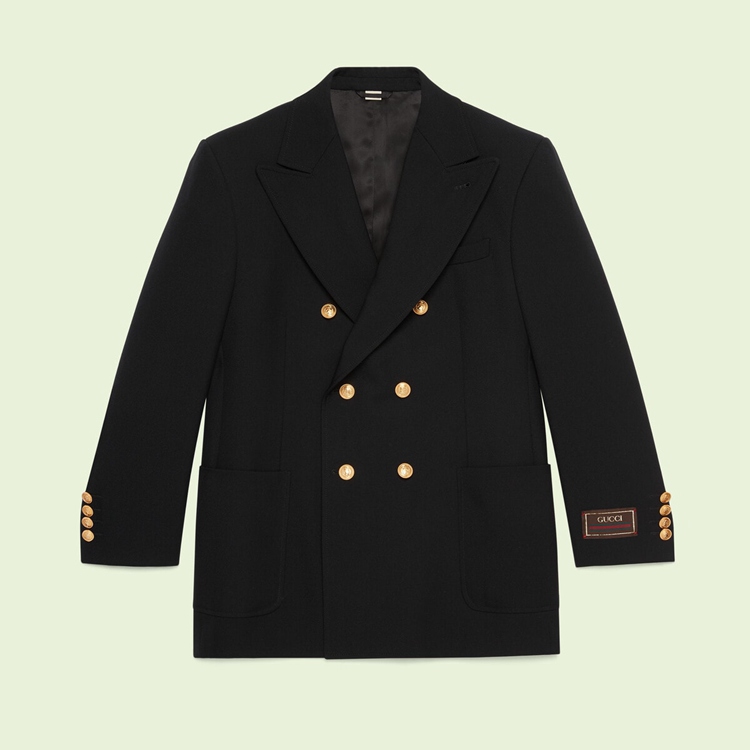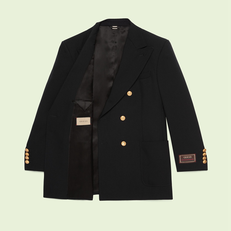 Style 685870 Z568J 1000Further exploring tailoring possibilities, suits Inspired by made-to-measure Retro elegance appear throughout The Gucci Love Parade collection. In a continuation of theme, The selection includes This single-breasted jacket Crafted from black wool.