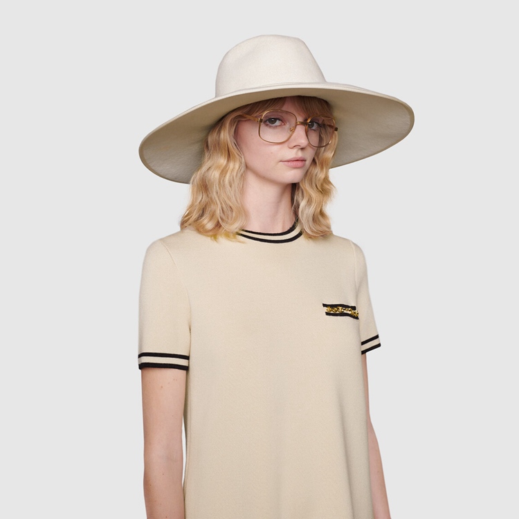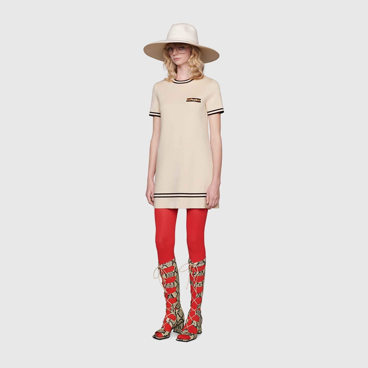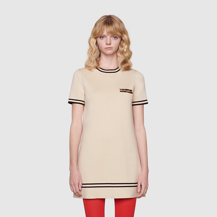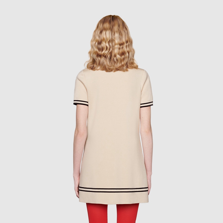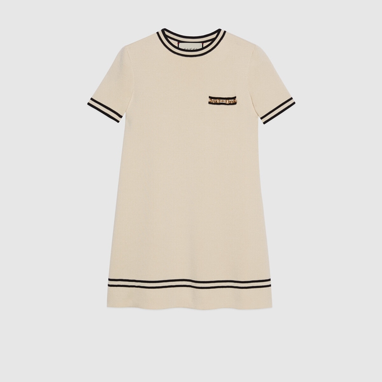 Style 650387 XKBNZ 9087 A white wool dress With black detail that trims The silhouette. The Epilogue collection conveys The idea that fashion’s old rules should be left behind and pieces should be timeless–not just in fashion For One season.