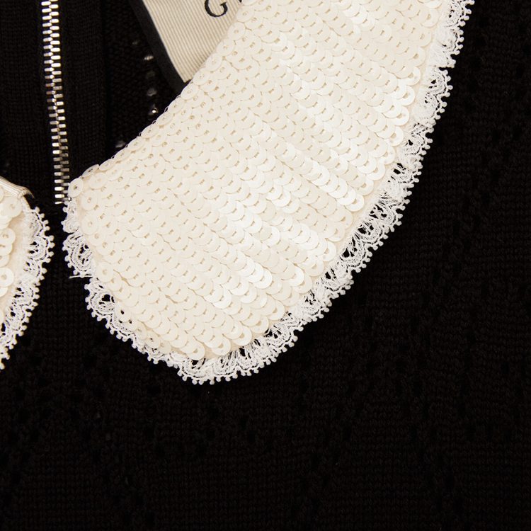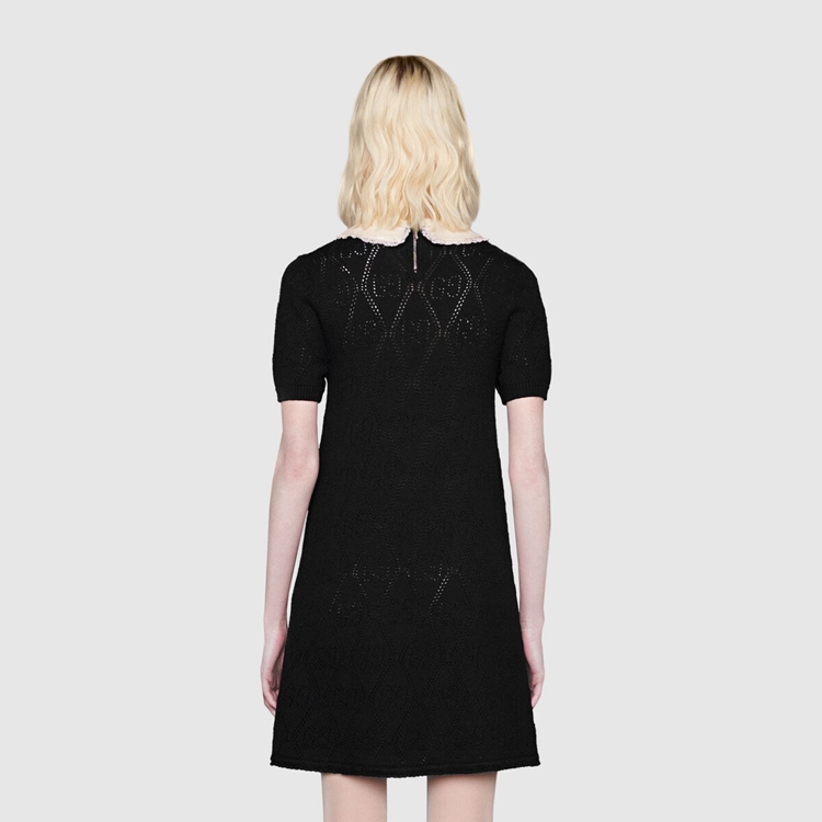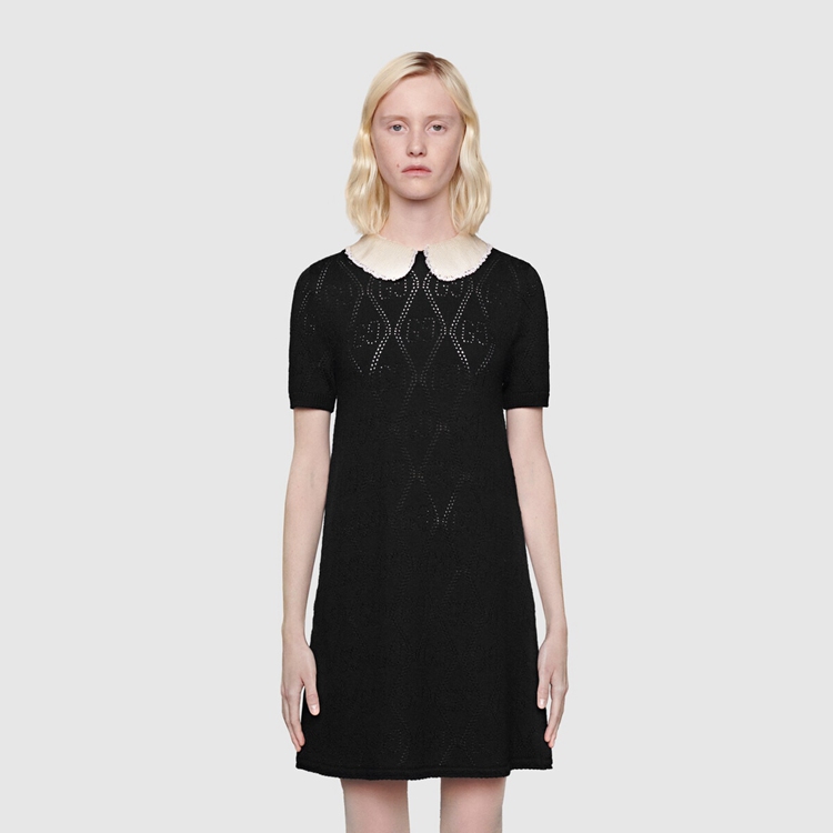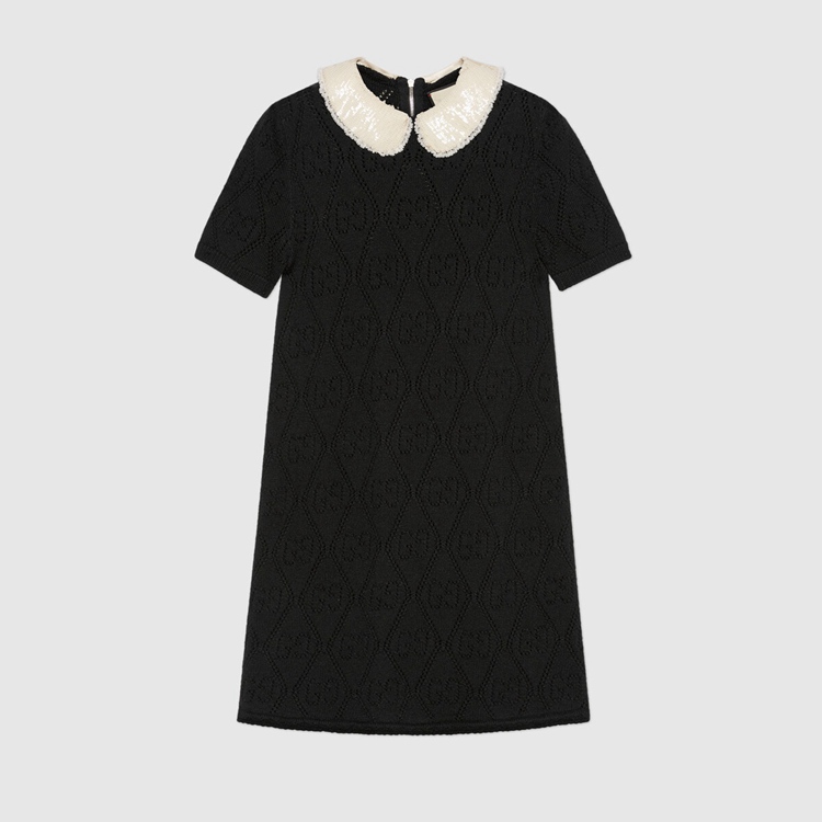 Style 646227 XKBQH 1043 Inspired by The original Gucci rhombi motif from The ’30s, The House’s monogram is revisited and reimagined in New variations each season. In This wool dress, The GG pattern appears as a perforated design, achieved using a needle punch technique.