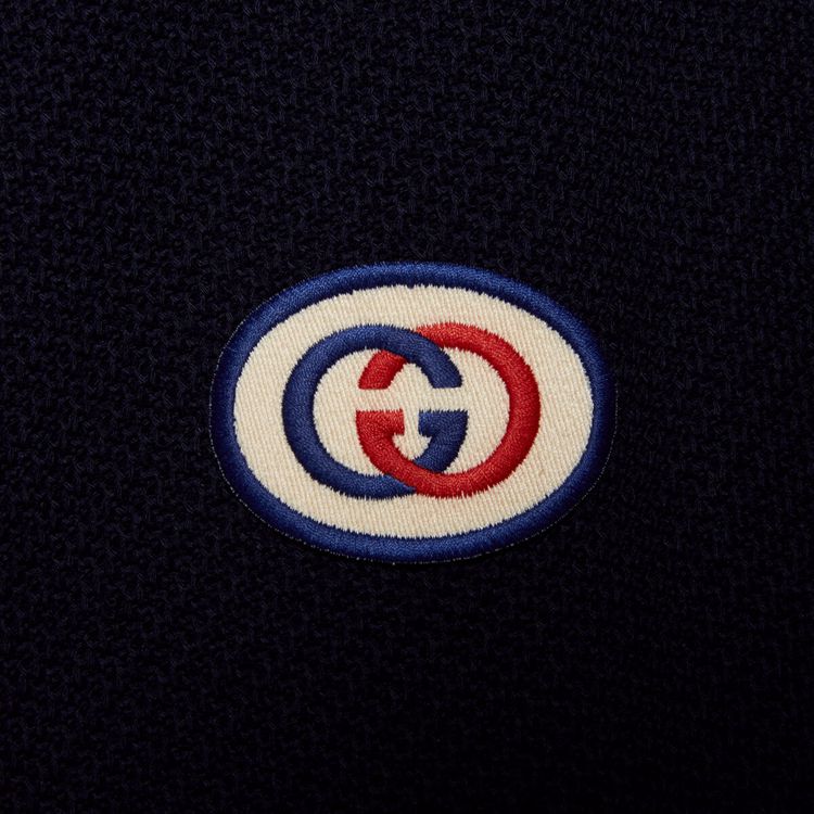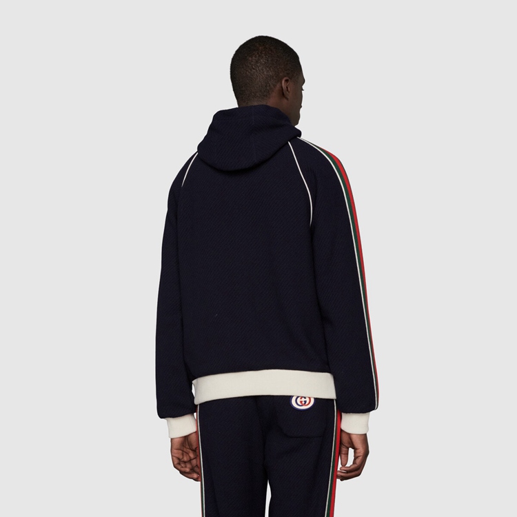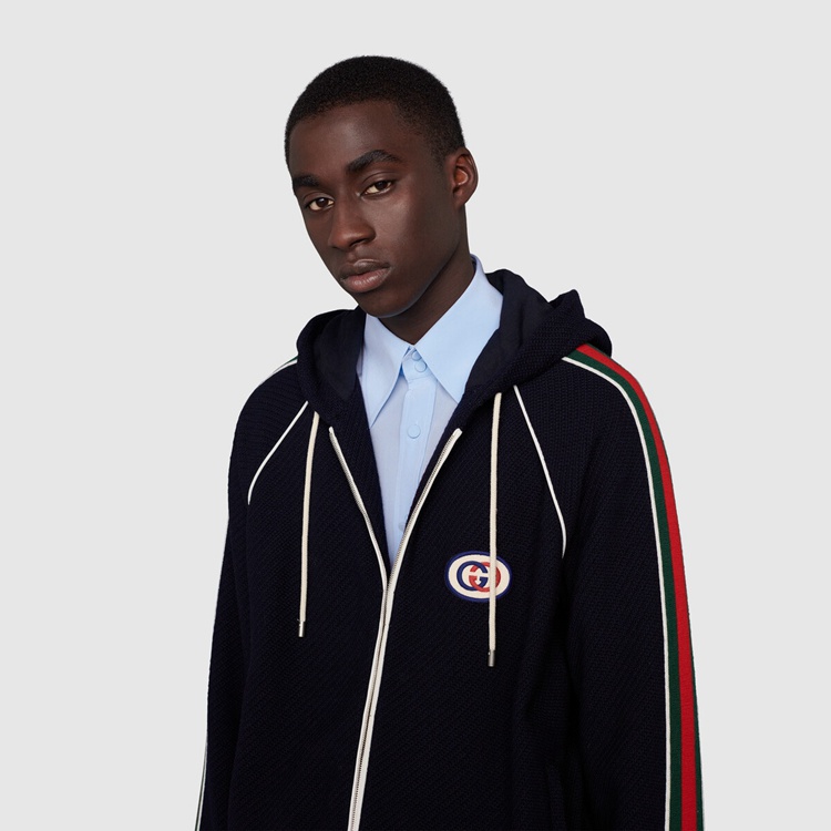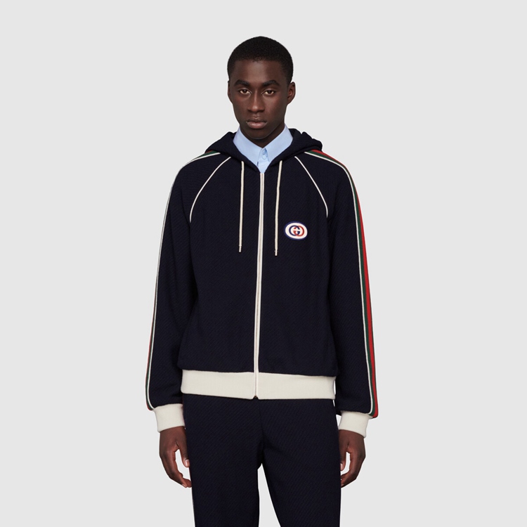 Style 673290 XJDUW 4548Mixing a blue base With The green and red Web, This jersey zip-up jacket is Imbued With a vintage, sportswear Inspired feel and is defined by an easy silhouette and contrast white piping. A sporty play on an Emblematic logo, The Interlocking G patch enriches The style.
