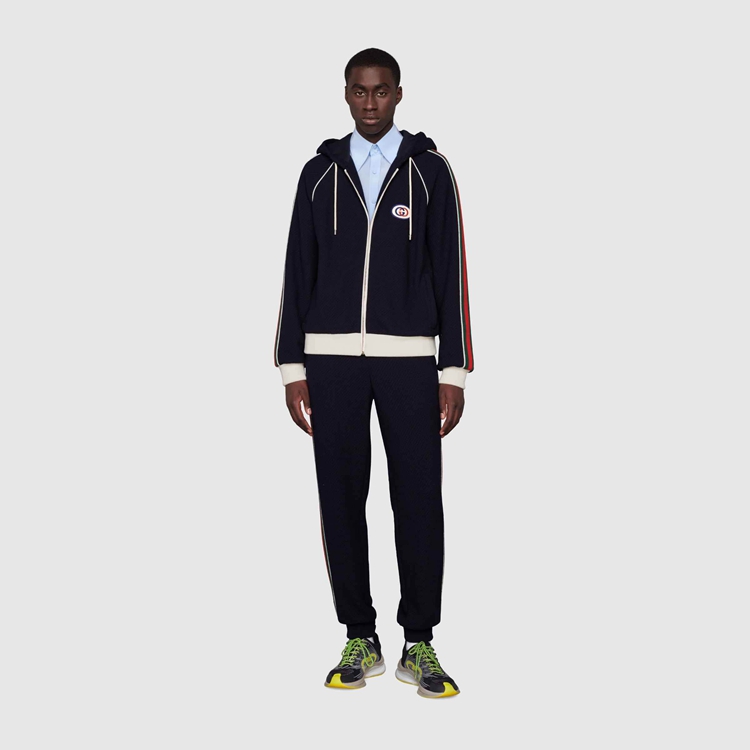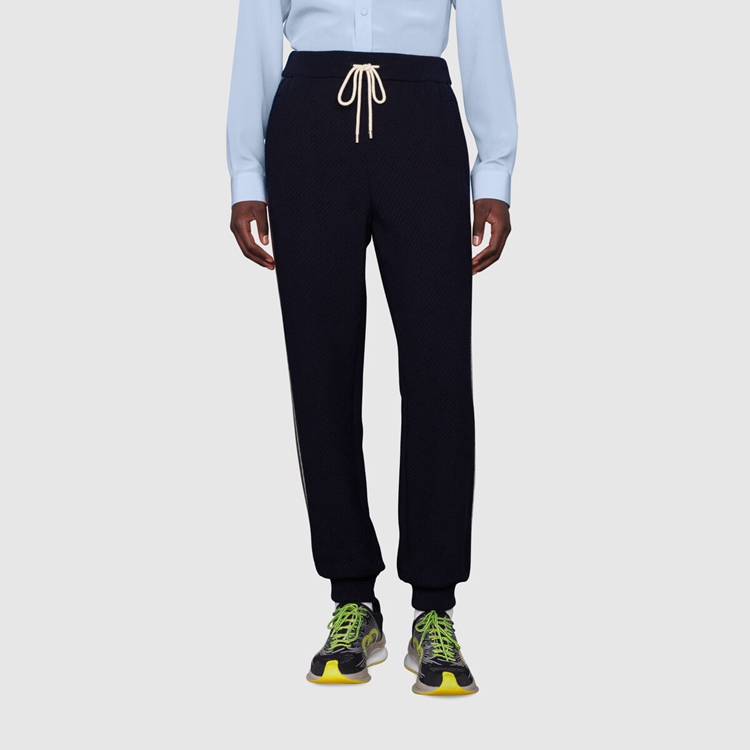 Style 673329 XJDUW 4548Mixing a blue base With The green and red Web, These jersey jogging pants are Imbued With a vintage, sportswear Inspired feel and is defined by an easy silhouette and contrast white piping. A sporty play on an Emblematic logo, The Interlocking G patch enriches The style on The back pocket.