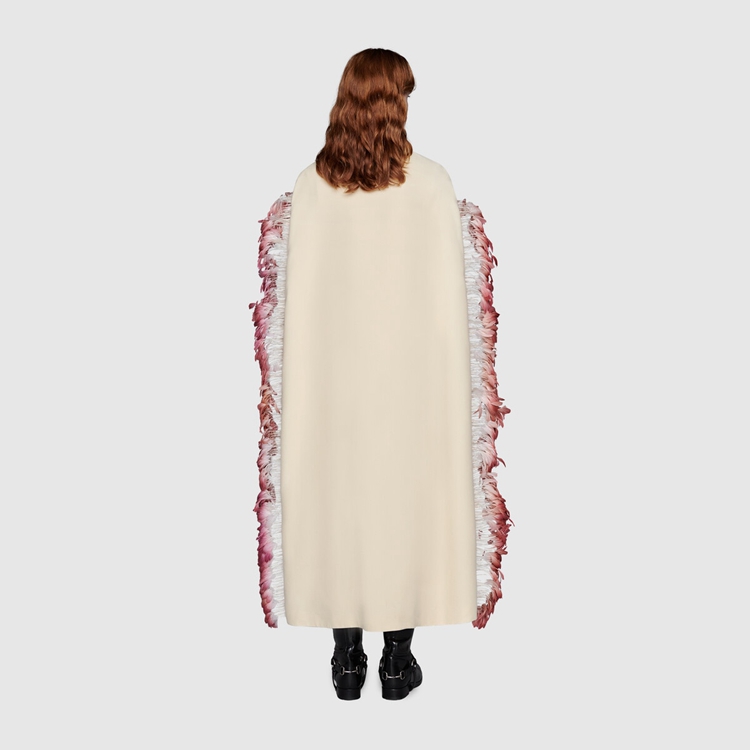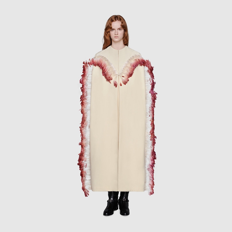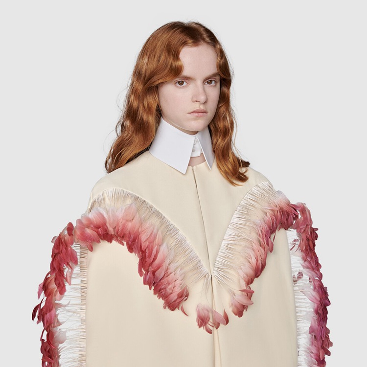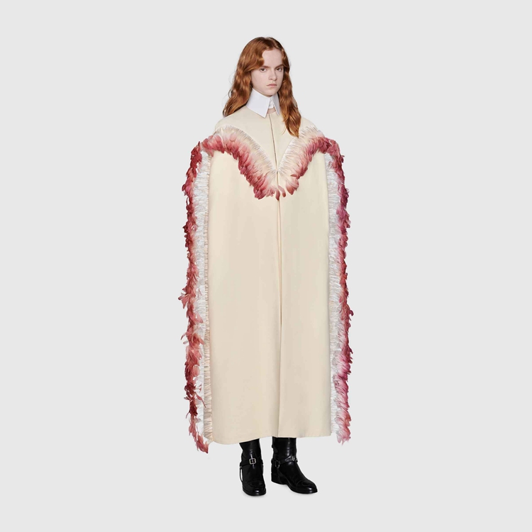 Style 680477 Z8AVG 9783 Gucci Aria’s collection presents streamlined silhouettes on clean fabrics that feature feather details— Recalling The everlasting femininity of forgotten cabaret artists. This wool silk coat is decorated With pink feathers that outline The shape in an unexpected way.