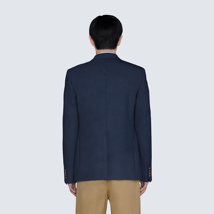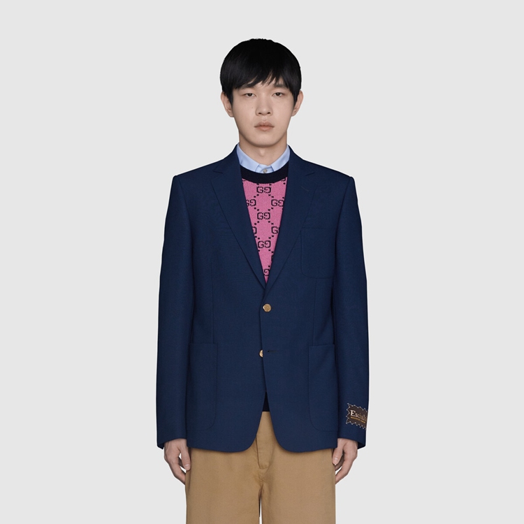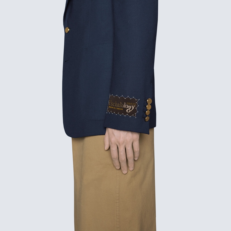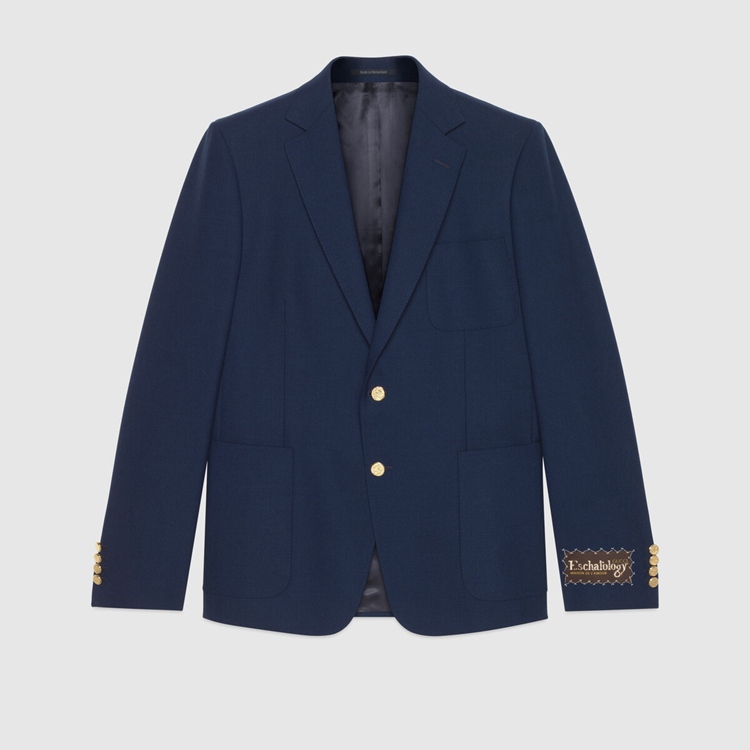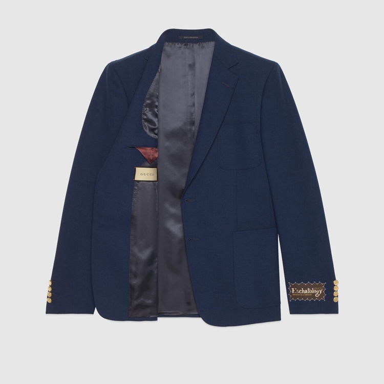 Style 654910 ZACG7 4912Tailored pieces weave New House elements into a contemporary expression of vintage inspirations. Embroidered upon This dark blue wool gauze tailored jacket is a Gucci Eschatology label, bringing to The fore The doctrine that explores The ultimate destiny of humans and universe.