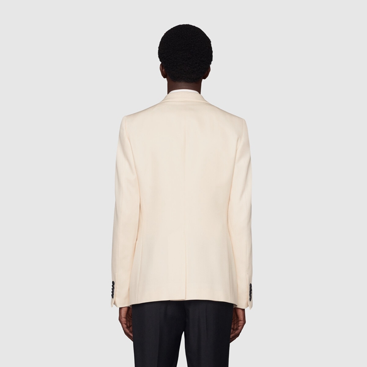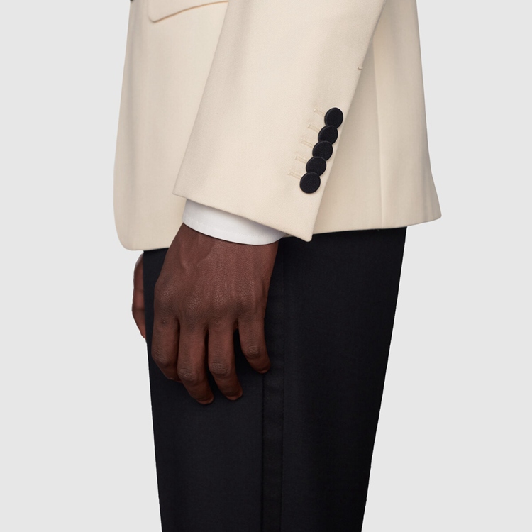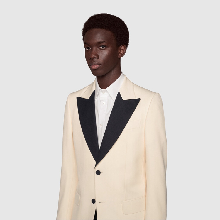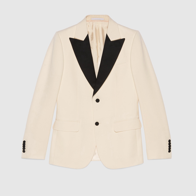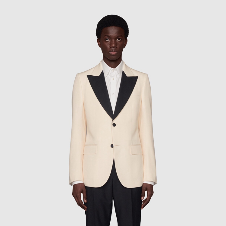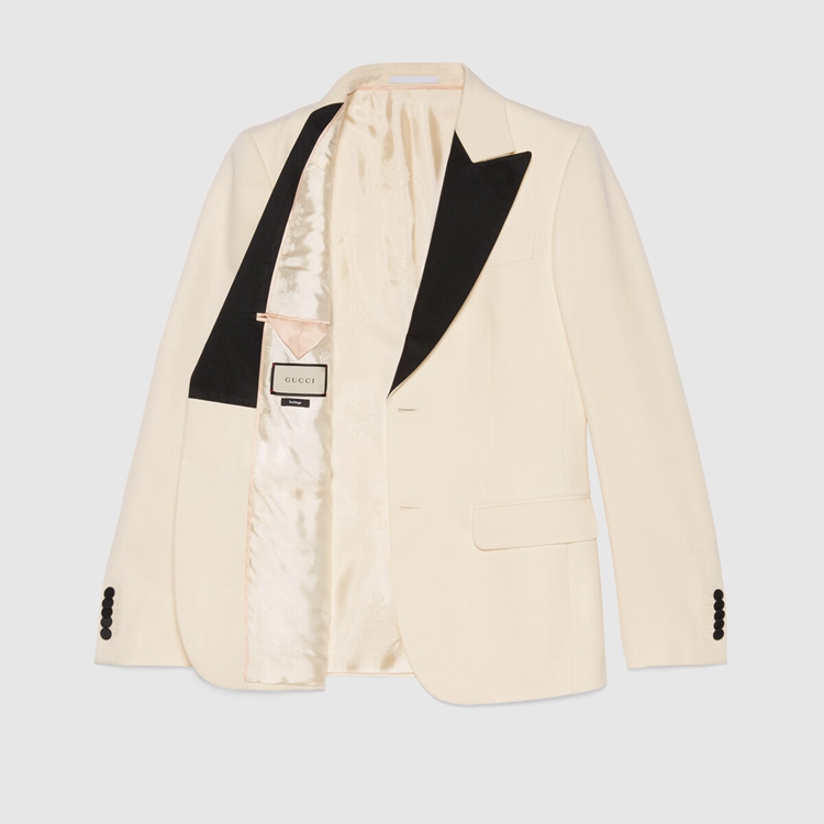 Style 610062 Z593H 9521 This white tuxedo Inspired jacket is punctuated by a black lapel in grosgrain. Gucci continues to push The established notions of tailoring and enhances them With New fits, fabrics and codes—often blurring The lines between masculine and feminine—setting The stage For a more fluid concept of dressing.